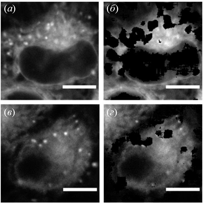 Рис. 2. Микрофотографии живых клеток HeLa Kyoto, окрашенных красителями (I) и (III) до (а, в соответственно) и после (б, г) удаления областей изображений, содержащих липидные капли. Удаление областей, содержащих липидные капли, осуществляли на основании различий времен жизни флуоресценции веществ при их окрашивании ЭПР и липидных капель. Масштабный отрезок – 5 мкм.