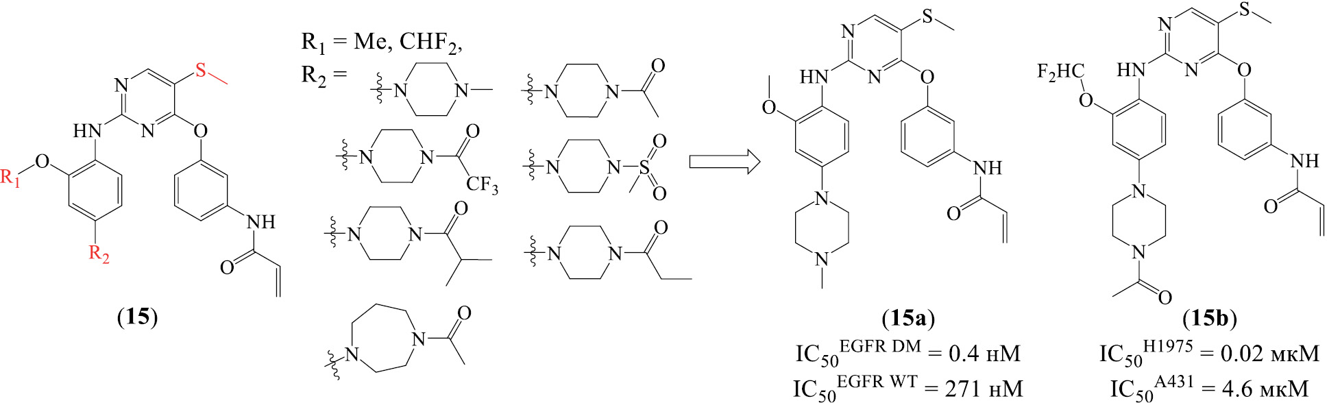 На основе структуры (15) (схема 2) была получена серия аналогов WZ4002 с метилтиольной группой в положении 5 пиримидинового цикла, установленной с целью усиления взаимодействия с мутантным Met790 и ограничением конформационного вращения фенильного линкера [42]. По результатам киназных тестов in vitro ингибитор (15а) превзошел референсное соединение (12) по активности в 27 раз и селективности в 18 раз. В клеточных тестах лучшие результаты показал ингибитор (15b) с активностью в 2.5 раза, а селективностью в 13 раз превосходящие таковые для ингибитора (12).