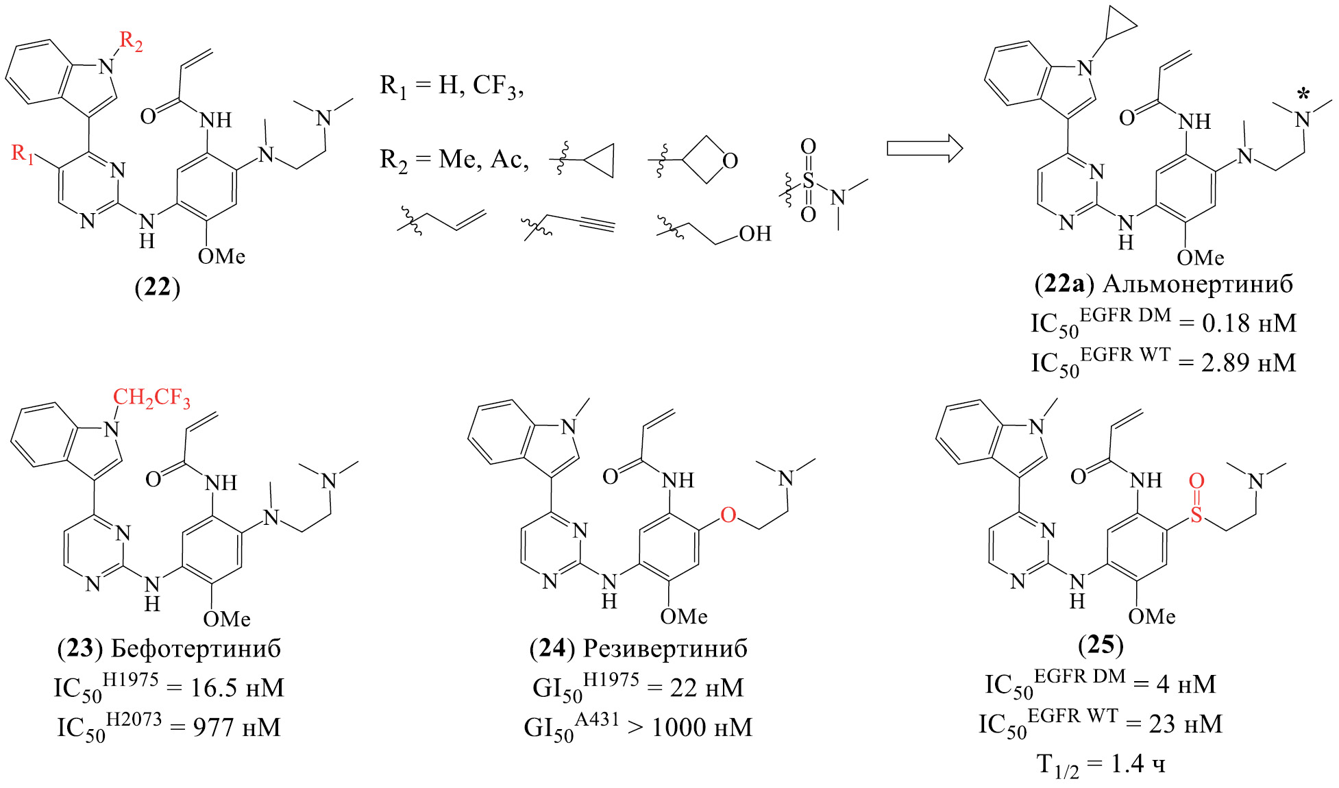 В ряду ингибиторов, полученных путем замены N-метильной группы (R2) на индольном фрагменте структуры (22) (схема 8), наиболее активным in vitro оказался N-циклопропильный ингибитор (22а), в 3 раза превзойдя осимертиниб по активности и в 8 раз – по селективности [49]. Соединение (22а) продемонстрировало выраженную противоопухолевую активность in vivo и удовлетворительные параметры фармакокинетики. Был идентифицирован один метаболит, деметилированный по азоту (указан звездочкой в формуле соединения (22а)). В клеточных тестах соединение (22а) также было активным и ингибировало рост клеток Н1975 с IC50 = 2.44 нМ и 208-кратной селективностью [50]. Ингибитор (22а) –альмонертиниб – прошел доклинические испытания, фазу II клинических исследований, и в 2020 г. был одобрен в качестве препарата для лечения НМРЛТ790М в КНР [51]. Альмонертиниб не вызывал некоторые характерные для осимертиниба побочные эффекты (гипергликемия, сыпь) и обладал более длительным периодом полувыведения 25 ч [52].