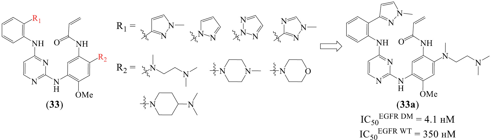 Ряды новых аналогов осимертиниба были получены заменой метилиндольного фрагмента на анилины, орто-замещенные пиразолами или триазолами, с целью повышения селективности к EGFR DM за счет более сильного взаимодействия с Met790 (схема 13) [69]. Умеренную и высокую активность in vitro показали только ингибиторы, содержащие ТМЭДА-боковую цепь. Наиболее активный и селективный ингибитор (33а) превзошел в 3 раза по активности и в 4 раза по селективности референсный ингибитор (12). Дальнейшие исследования выявили перспективный ингибитор лимертиниб (34) (рис. 4). Он показал субнаномолярную киназную активность in vitro с 20-кратной селективностью [70]. Лимертиниб был эффективен in vivo, а также вызывал регрессию опухоли у больного НМРЛ с приобретенной резистентностью к TKI EGFR раннего поколения [71]. В настоящее время ингибитор (34) проходит III фазу клинических испытаний (NCT04143607).