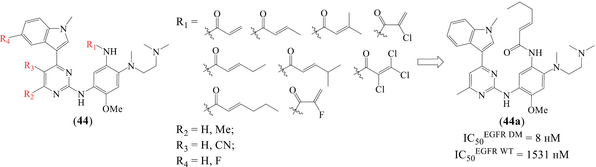 Было исследовано влияние на активность некоторых электронодонорных и электроноакцепторных заместителей при акриламидной “боеголовке” (R1), а также в пиримидиновом (R2, R3) и индольном (R4) фрагментах структуры (44) (схема 17) [83]. Показано, что введение электроноакцепторных заместителей в акриламидную группу в целом повышало активность ингибиторов, но снижало селективность; электронодонорные заместители в целом снижали ингибирующую активность. Среди модификаций акриламида предпочтение было отдано гексенамидной группе в силу наиболее высокого достигнутого значения селективности. Цианогруппа в положении 5 и метильная группа в положении 4 пиримидинового цикла, предназначенные для дополнительного взаимодействия ингибитора с Met790, обусловили умеренное снижение активности, но повышение селективности ингибиторов. Гексенамидная группа в комбинации с 4-метилпиримидиновым остовом в структуре соединения (44а) позволили повысить селективность в отношении EGFR DM в 95 раз при сохранении целевой активности на уровне референса (12). Все соединения со фторированным индолом показали сниженную активность.