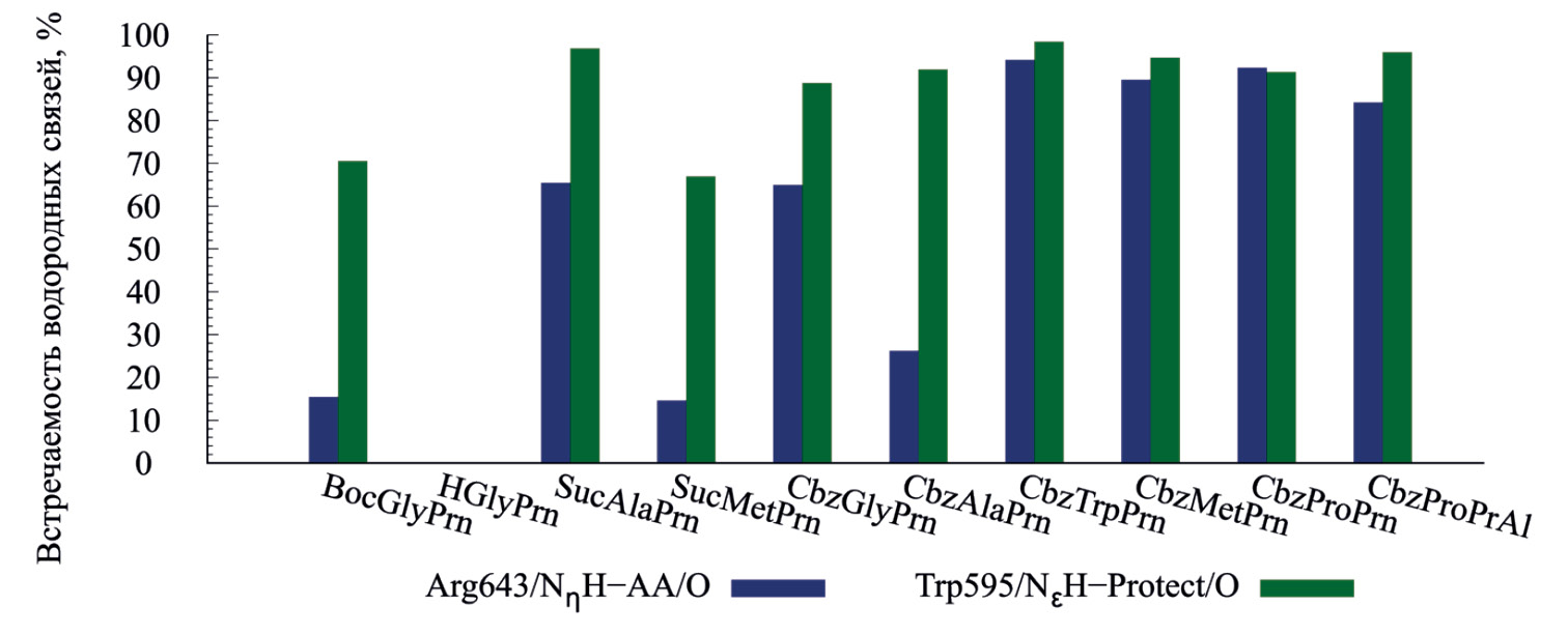 Строение активного сайта PEP благоприятствует связыванию ингибиторов, несущих гидрофобную защитную группу на N-конце, таких как BocGlyPrn или CbzGlyPrn. Все они образуют устойчивые водородные связи с Trp595 и Arg643, описанные выше (табл. 2), а их трет-бутоксикарбонильные или карбобензоксильные защитные группы взаимодействуют с дальней гидрофобной зоной, что выражается в их прочном связывании с PEP (рис. 3). Бензольное кольцо карбобензоксильной защитной группы дополнительно образует π-стэкинг-взаимодействие с остатком Phe173 (табл. 2). Сукцинильная защитная группа заряжена отрицательно, что, с одной стороны, исключает взаимодействие с дальней гидрофобной зоной PEP, но, с другой стороны, создает водородные связи и ионные мостики с остатками Arg643 и Arg252. Если же ингибитор имеет свободный и положительно заряженный N-конец, как HGlyPrn, то он лишен возможности взаимодействовать с дальней гидрофобной зоной и не может образовывать водородную связь с Trp595. Более того, это приводит к электростатическому отталкиванию N-конца от Arg643, что дестабилизирует водородную связь последнего с карбонильным углеродом. Это объясняет неспособность HGlyPrn подавлять активность PEP.