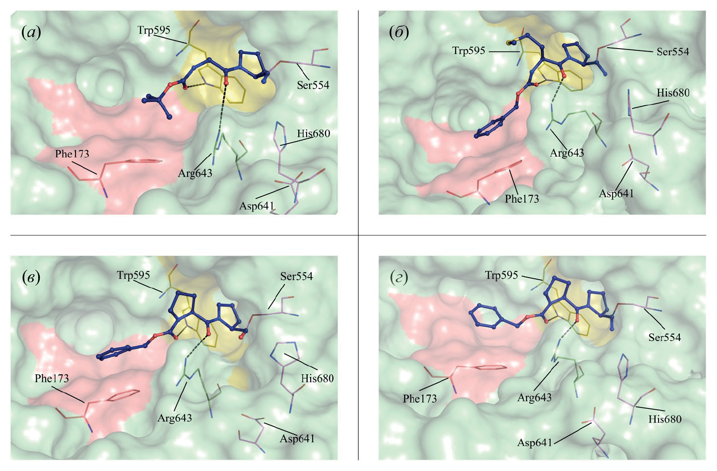 Рис. 4. Конформации пирролидоновых ингибиторов пролилэндопептидазы (показаны темно-синим цветом) в активном центре DPP4, полученные молекулярно-динамическим моделированием. Водородные связи показаны черным пунктиром. Желтым цветом изображена ближняя гидрофобная зона, голубым – гидрофобная полость, красным – негативный выступ. (а) – HGlyPrn; (б) – CbzGlyPrn; (в) – CbzMetPrn; (г) – SucMetPrn.