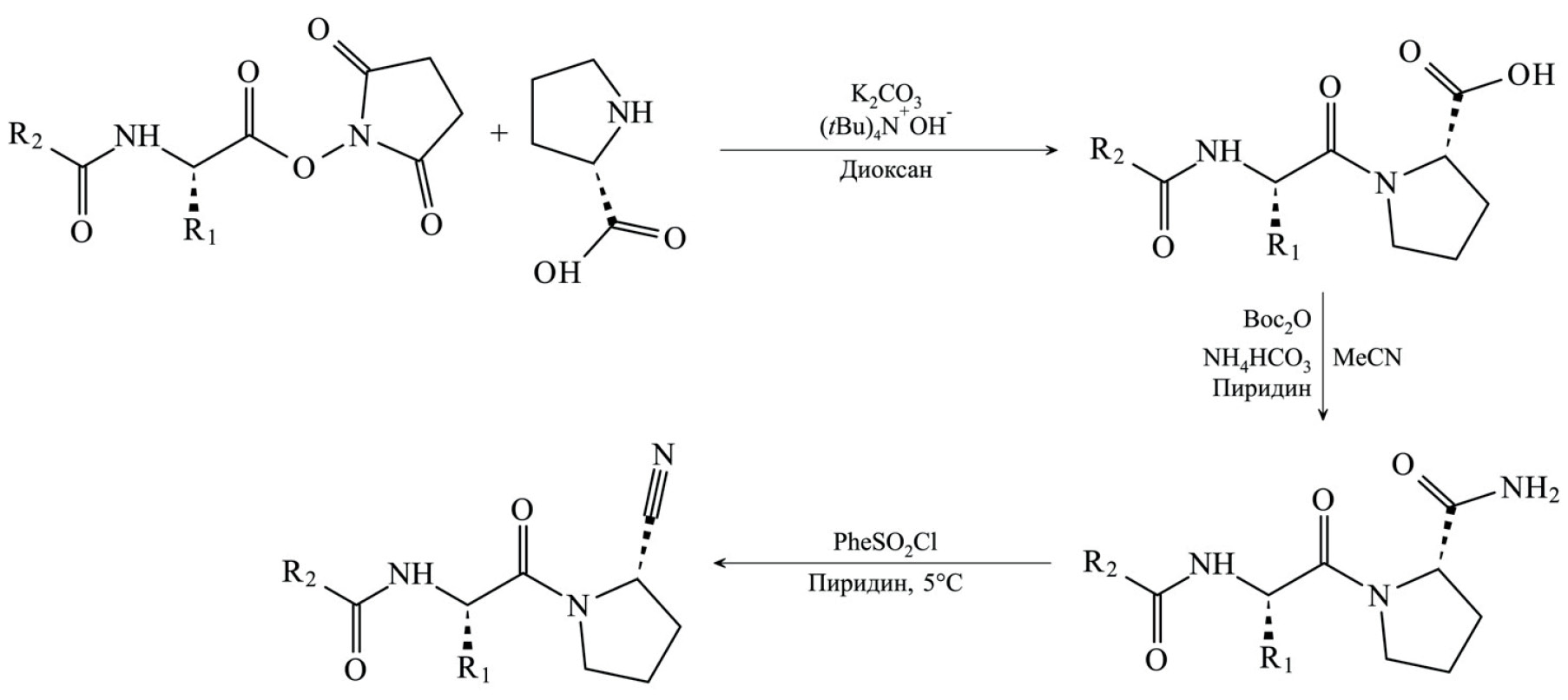 Рис. 5. Общая процедура синтеза N-защищенных карбонитрилов дипептидов. R1 – боковая цепь аминокислоты, R2 – трет-бутил или бензил.