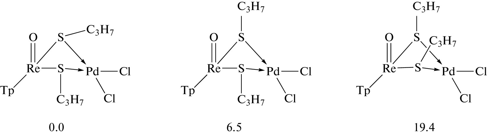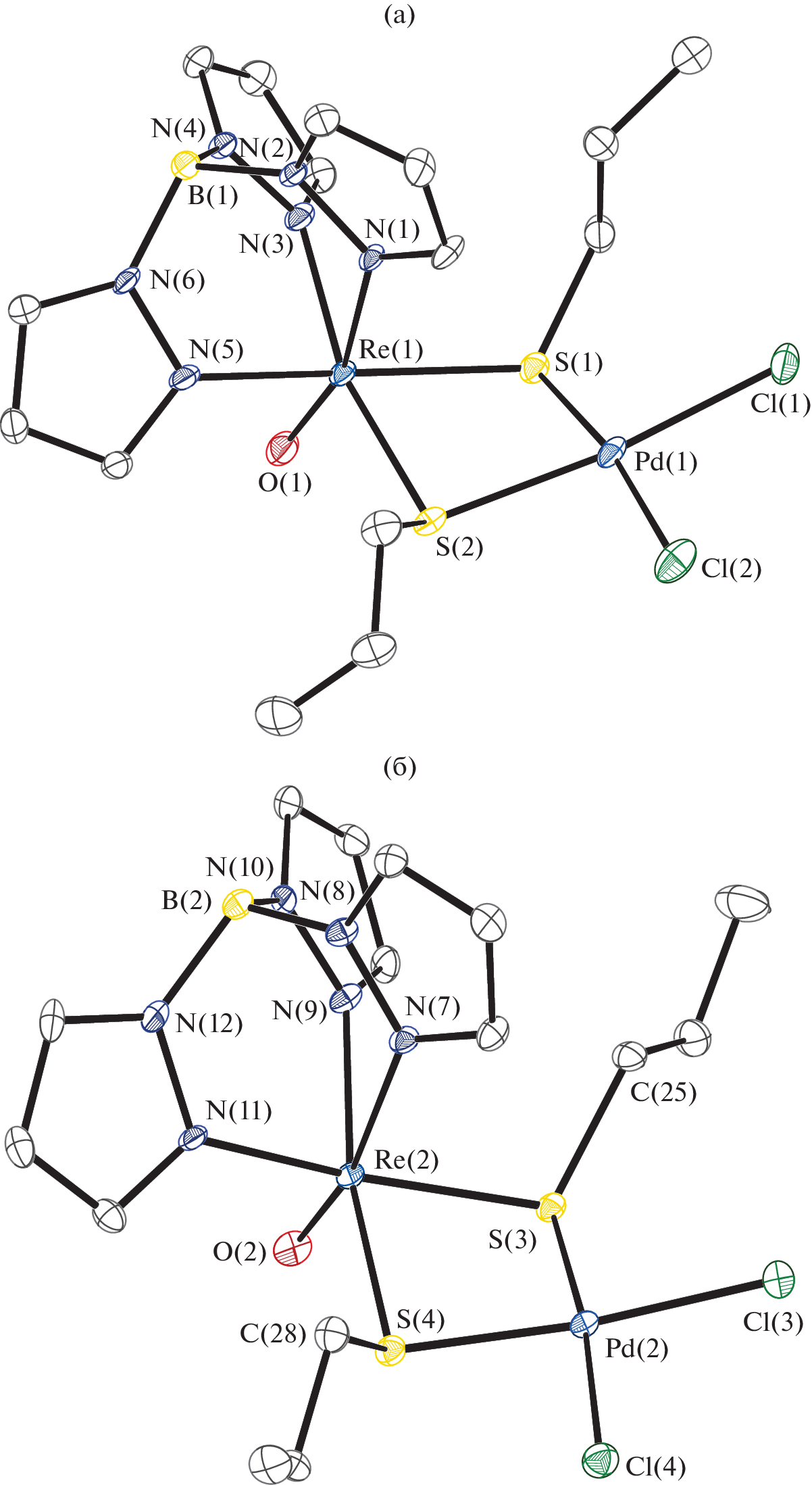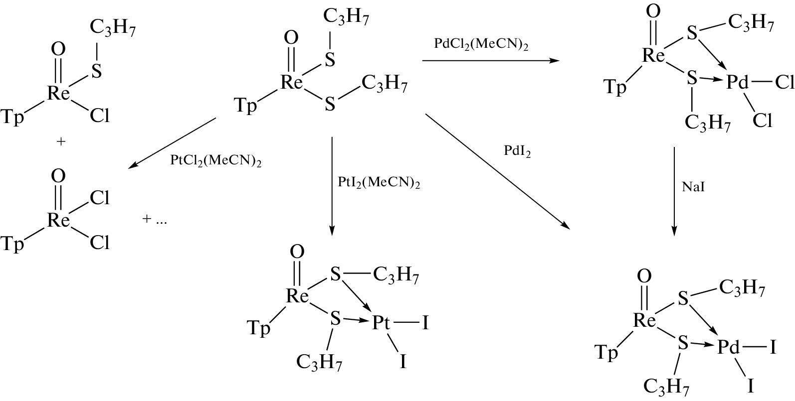 The reactions of TpReO(SnC3H7)2 (Tp = tris(pyrazolyl)borate anion) with acetonitrile complexes PdCl2(MeCN)2 and PtI2(MeCN)2 in toluene solutions resulted in the formation of new heterometallic rhenium complexes TpReO(µ-SnC3H7)2MX2 (MX2 = PdCl2 (I), MX2 = PtI2 (II)). A similar complex TpReO(µ-SnC3H7)2PdI2 (III) was formed either on treatment of I with NaI in dichloromethane or in the reaction of TpReO(SnC3H7)2 with a suspension of PdI2 in toluene. Complexes I–III were characterized by IR and NMR spectroscopy and by X-ray diffraction (CCDC nos. 2172225–2172227).