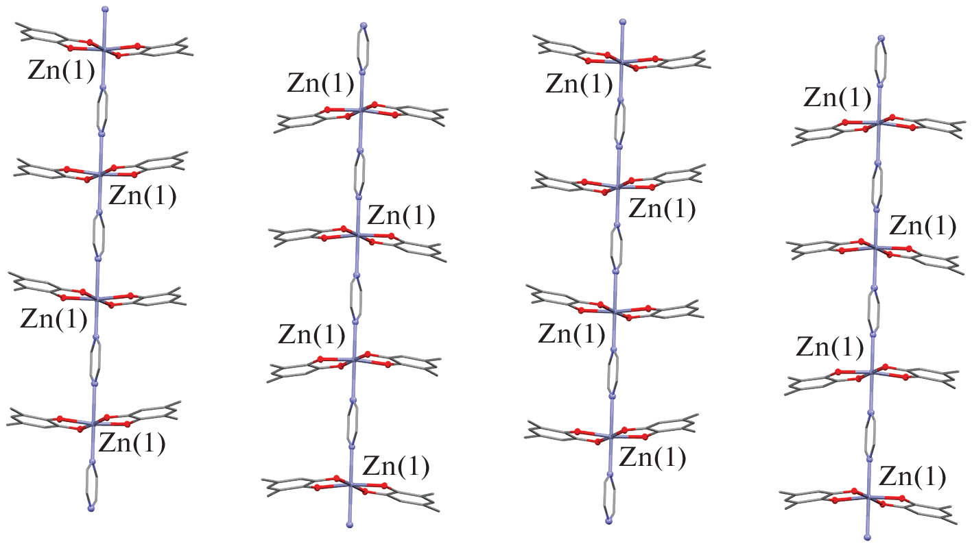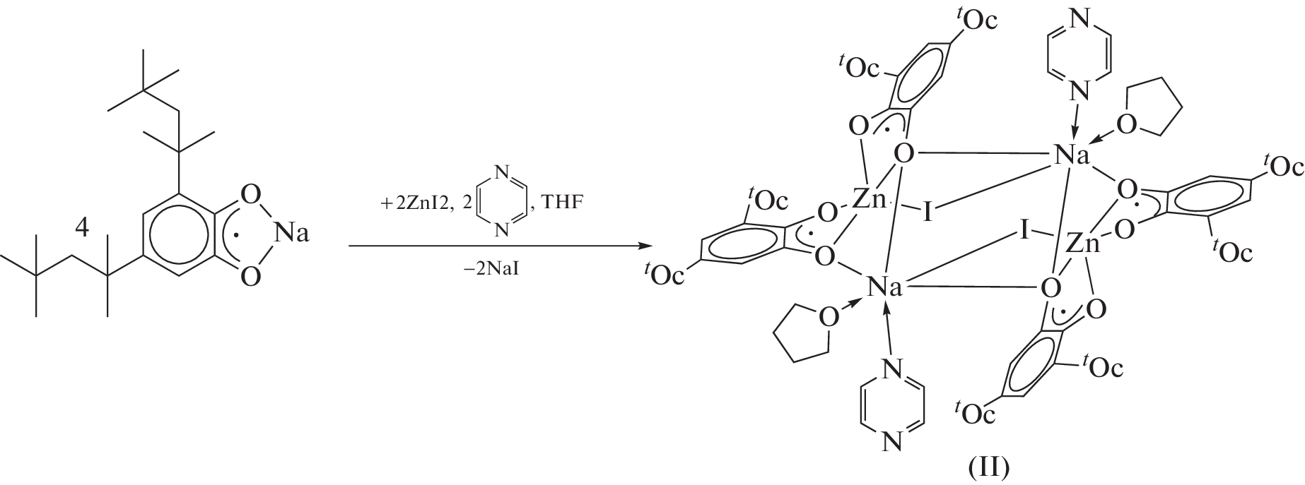 New zinc bis-o-semiquinolate complexes based on 3,5-di-tert-octyl-o-benzoquinone bearing the N-donor ligand (pyrazine) coordinated to the metal are synthesized. Two different products can be obtained depending on the synthesis method: coordination polymer (direct oxidation of metallic zinc with o-quinone (CIF file CCDC no. 2250574 (I)) or polynuclear cluster (exchange reaction (CIF file CCDC no. 2250575 (II)). The coordination polymer is linear and free of intermolecular π,π interactions between the aromatic fragments of the adjacent molecules. The magnetochemical study of complexes I and II shows that intramolecular antiferromagnetic exchange interactions between spins of the o-semiquinolate radical centers dominate.