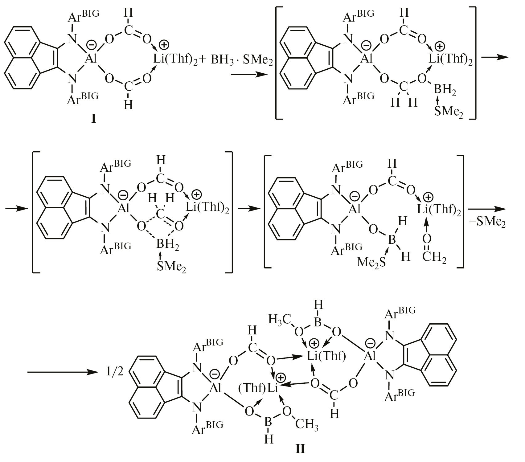 К раствору соединения I в толуоле конденсацией в вакууме добавили 1 мольный эквивалент BH3 · SMe2. Кристаллизацией (~24 ч) из полученной реакционной смеси были выделены синие ромбоэдрические кристаллы продукта гидроборирования [(ArBIG-bian)Al(μ-OC(H)O)(OB(H)OCH3)Li(Тhf)]2 (II) с выходом 55% (схема 2), охарактеризованного методами ИК- и ЯМР-спектроскопии, элементным анализом, а также РСА.