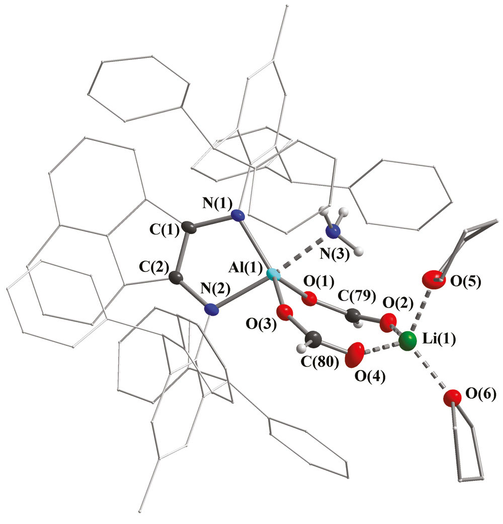 Синтез [(ArBIG-bian)Al(NH3)(μ-OC(H)O)2Li(Еhf)2] (IV). К замороженному темно-синему раствору соединения I, полученного in situ действием избытка CO2 на 0.5 ммоль (0.86 г) раствора дигидрида ([(ArBIG-bian)Al(H)2]–[Li(Thf)4]+, в ТГФ (20 мл) сконденсировали 0.51 ммоль (12.3 мл) NH3. При медленном нагревании реакционной смеси до комнатной температуры цвет раствора изменился с темно-синего на зеленый. Кристаллизацией из полученного раствора выделили зеленые кристаллы IV ∙ 2 Thf ромбоэдрической формы. Выход — 0.51 мг (70%). Тпл = 158—160˚С (разл.).