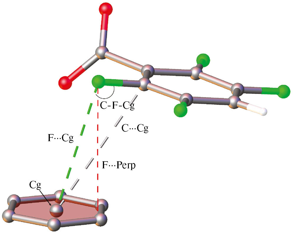 По данным рентгеноструктурного анализа ионное соединение [Cd(6Htfb)(H2O)3]n · · n(6Htfb) · 2nH2O (I) образовано катионным цепочечным 1D-координационным полимером {Cd(H2O)4(6Htfb)}n+, в структуре которого соседние ионы кадмия связаны друг с другом двумя мостиковыми молекулами воды. Ионы кадмия достраивают свое окружение до квадратной антипризмы (CdO8, CShM = 1.445) координацией хелатно связанного аниона 6Htfb и двух монодентатно связанных молекул воды. Компенсация положительного заряда катионной цепочки происходит за счет не участвующего в координации к иону металла аниона 6Htfb, который связан водородными связями с координированными к ионам кадмия молекулами воды (см. табл. 2). Координированные и сольватные молекулы воды, а также атомы кислорода и фтора анионов 6Htfb задействованы в водородном связывании с формированием супрамолекулярного 2D-слоя (см. табл. 2, рис. 1). Также полимерная цепь дополнительно стабилизирована за счет C–F···π-взаимодействий (см. табл. 4, рис. 2) и π···π-взаимодействий между парами 6Htfb анионов. Основные длины связей и расстояния приведены в табл. 5.