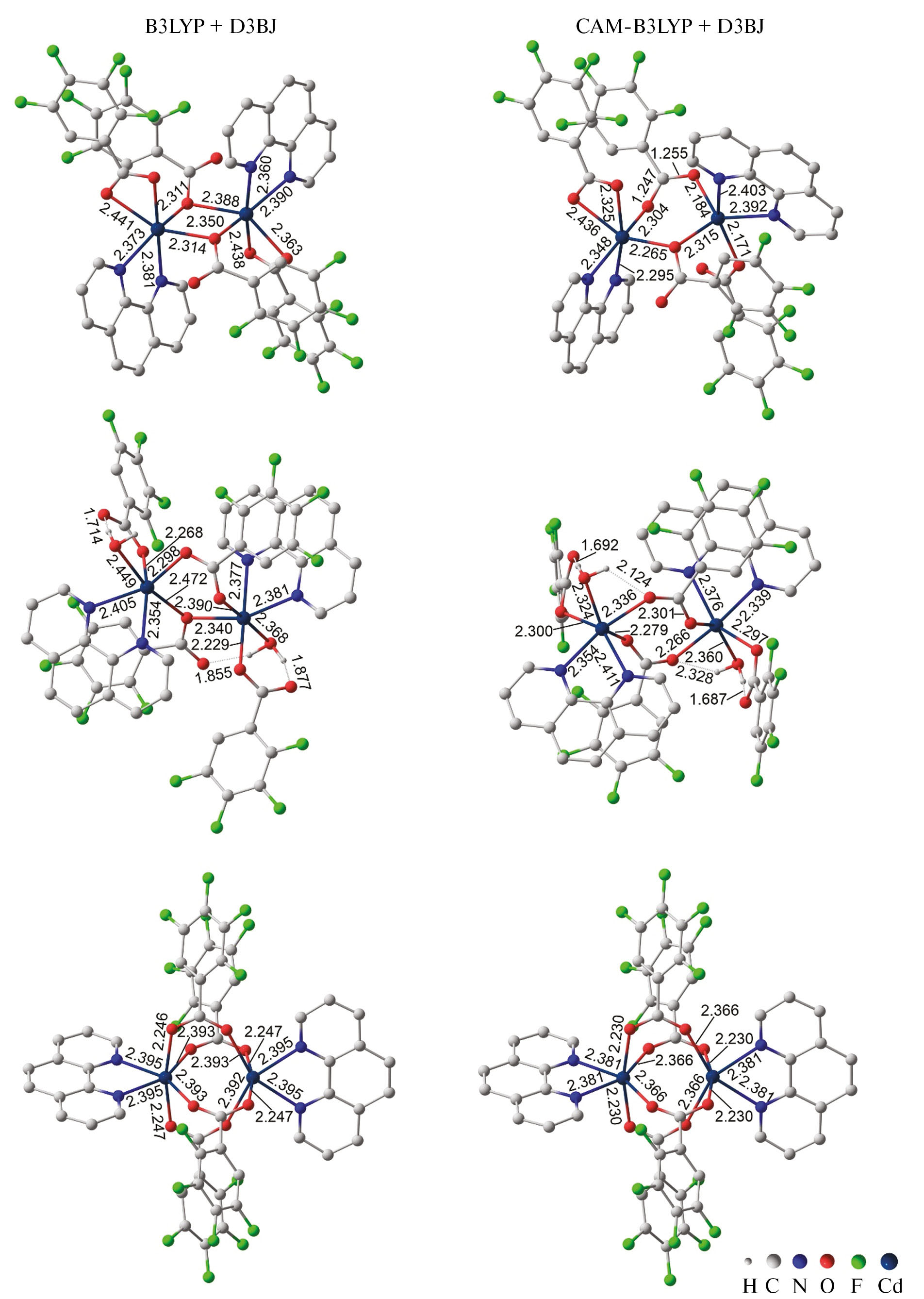New cadmium 2,3,4,5-tetrafluorobenzoate (6HTfb) and 2,3,5,6-tetrafluorobenzoate (4Htfb) complexes, [Cd(6HTfb)(H2O)3]n·(6HTfb)·2nH2O (I), [Cd3(Phen)2(6HTfb)6] (II, Phen = 1,10-phenanthroline), [Cd2(Phen)2(4Htfb)4]n·2nH2O (III), and [Cd(Phen)2(4Htfb)2] (IV), were synthesized. Analysis of the obtained results and published data demonstrated that a decrease in the number of fluorine substituents is unfavorable for the formation of coordination polymers comprising stacked alternating fluorinated and nonfluorinated aromatic moieties. In the case of 2,4,5-trifluorobenzoate complex, a typical trivial structure of the binuclear cadmium complex with ligand-shielded metal core is formed. The synthesis of 2,3,4,5- and 2,3,5,6-tetrafluorobenzoate complexes produced an intermediate situation and demonstrated that the structure of complex formation products is affected by not only the number, but also the positions of fluorine substituents. Using quantum chemical calculations, it was shown that the formation of coordination polymers requires a molecular precursor with a Chinese lantern structure stable in solutions, while the formation of unusual flattened binuclear complexes with additionally coordinated water molecules requires doubly bridged binuclear complexes able to switch to a conformation with exposed coordinatively unsaturated metal centers.