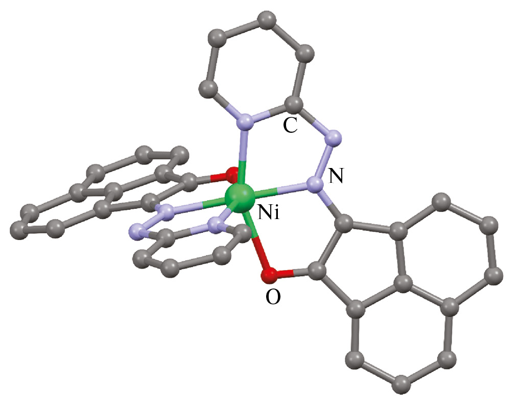 Синтез [Ni(Py-mhan)2] (I). К суспензии NiCl2 · 6H2O (100 мг, 0.42 ммоль) в 20 мл этанола добавляли Py-mhan (230 мг, 0.84 ммоль) и 200 мкл триэтиламина. В течение 2 ч выпал красный мелкокристаллический осадок, который отфильтровывали, промывали этанолом и сушили в вакууме. Выход I 203 мг (80%). Монокристаллы I, пригодные для рентгеноструктурного анализа, получали путем медленной диффузии паров диэтилового эфира в раствор I в дихлорметане.