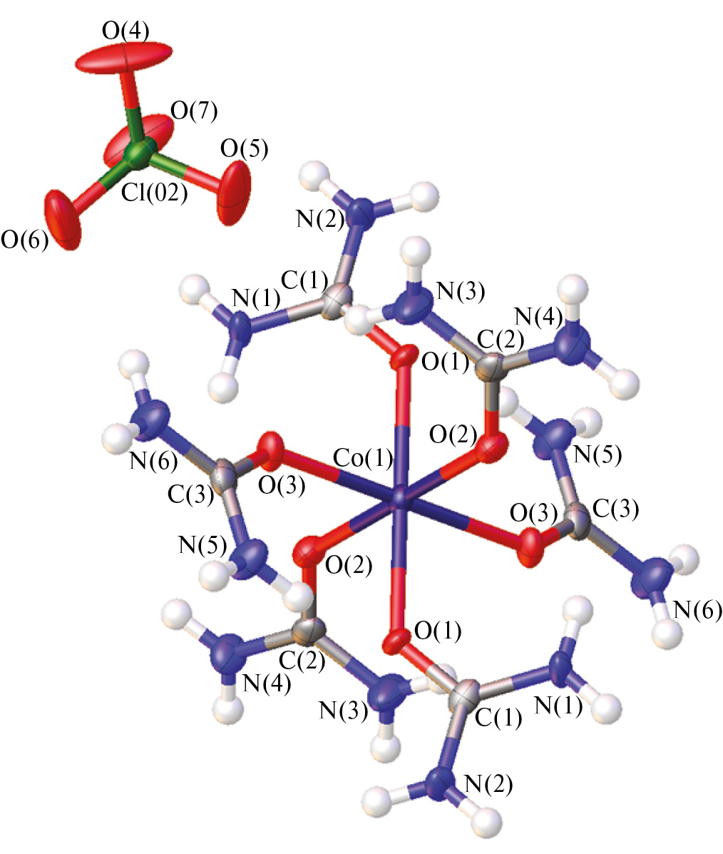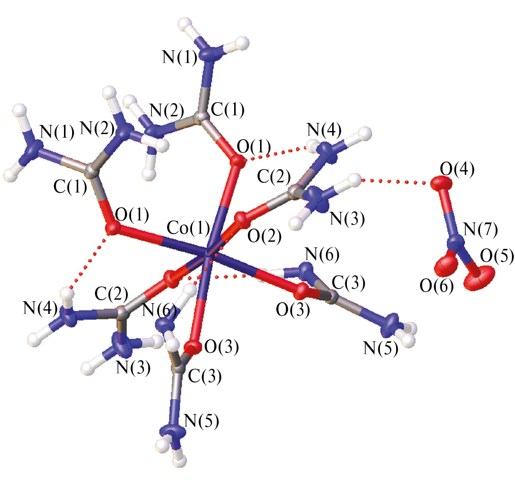 В литературе описаны кристаллические структуры координационных соединений нитрата кобальта(II) с карбамидом в мольных отношениях 1 : 2, 1 : 4 и 1 : 10. В структуре комплексов [Co(Ur)2(H2O)4](NO3)2 (P¯1) [17], [Co(Ur)4(H2O)2](NO3)2 (P21/n) [18] и [Co(Ur)6](NO3)2 ∙ 4Ur (P¯1) [19] лиганд Ur проявляет монодентантную координацию через атом кислорода. При этом для [Co(Ur)2(H2O)4](NO3)2 и [Co(Ur)6](NO3)2 ∙ 4Ur получены величины R-факторов, равные 14.9 и 16.8% соответственно, что подвергает сомнению точность определения параметров структур. В [20, 21] представлен синтез, а также результаты изучения кристаллической и молекулярной структуры координационного полимера [Co(Ur)4]n(NO3)2n (P21/c). Показано, что в полученном соединении карбамид ведет себя и как монодентантный, и как мостиковый лиганд, демонстрируя координацию через донорные атомы кислорода и азота.