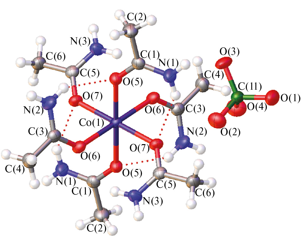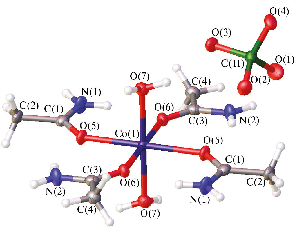 В случае ацетамида получены соединения с мольным отношением кобальт : ацетамид, равным 1 : 4 и 1 : 6. Для комплексов [Co(AA)4(H2O)2](NO3)2 (P21/c) и [Co(AA)6](NO3)2 (P-3), показано, что молекулы ацетамида так же, как и карбамида, координируются через донорный атом кислорода [22].