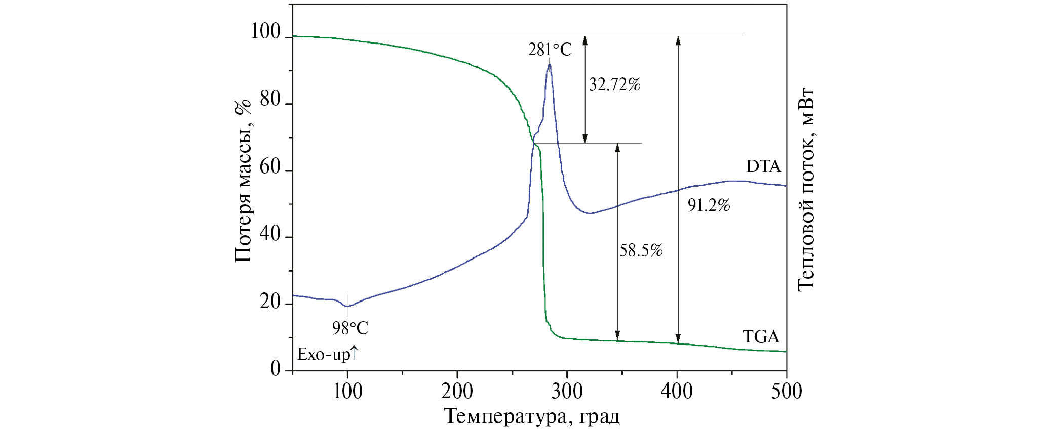 В случае соединения VI плавление наблюдается в интервале 95–103°С. Постепенная потеря массы в интервале температур до 268°С может быть связана с разложением части молекул ацетамида в образовавшемся расплаве. Выше 270°С наблюдается выраженный экзоэффект, который, по-видимому, является наложением двух эффектов и вызван реакцией окисления оставшихся молекул AA перхлорат-ионами. Выше 310°С ход кривых ТГ и ДСК практически не изменяется. Продуктом разложения также является CoO1-δ, который при охлаждении в атмосфере воздуха окисляется до Co3O4.