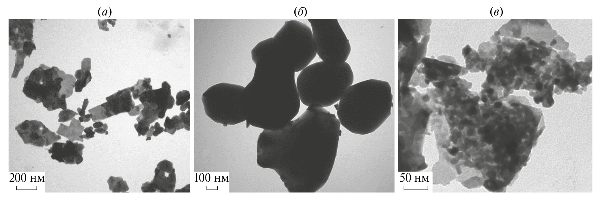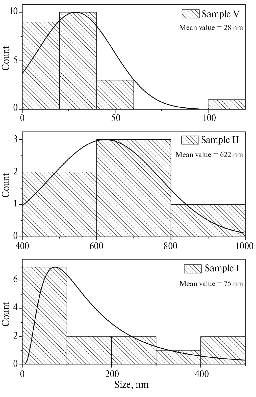 На основе результатов ПЭМ определено распределение частиц по размерам (рис. 11). Значения, полученные по методу Дебая–Шеррера (приведены в скобках), коррелируют с данными ПЭМ. Показано, что в образце Co3O4, полученном при термолизе соединения V, преобладают частицы с размером 24 (46) нм. Для образцов I и II характерны размеры частиц около 75 (91) и 622 (687) нм соответственно.