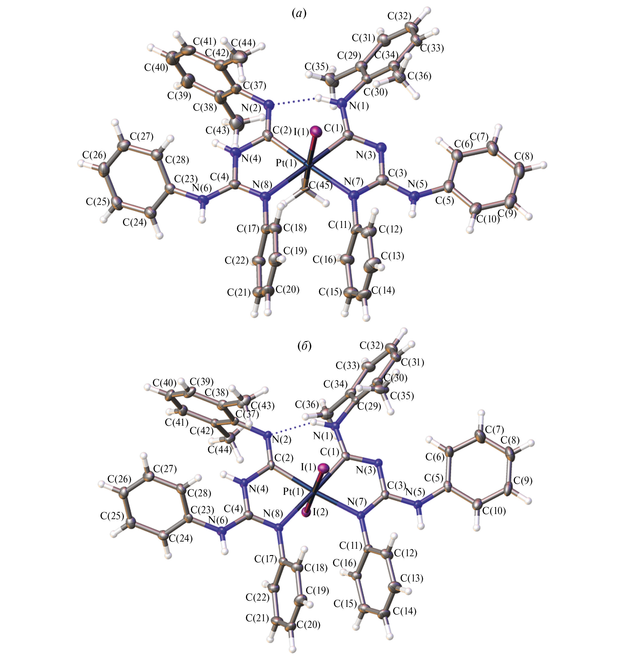 В работе использовались коммерческие реактивы и растворители (Merk, ВЕКТОН) без дополнительной очистки, кроме CH2Cl2 и Et2O. CH2Cl2 перегоняли над P2O5, Et2O – над металлическим натрием в присутствии бензофенонa. Комплексы [Pt{C(N(H)Ar)(NC(N(H)Ph)N(Ph)}2] (Ar = Xyl (а), Mes (б), pTol (в); Iа–в и Iа ∙ CF3CO2H) синтезированы по известным методикам [19, 20].