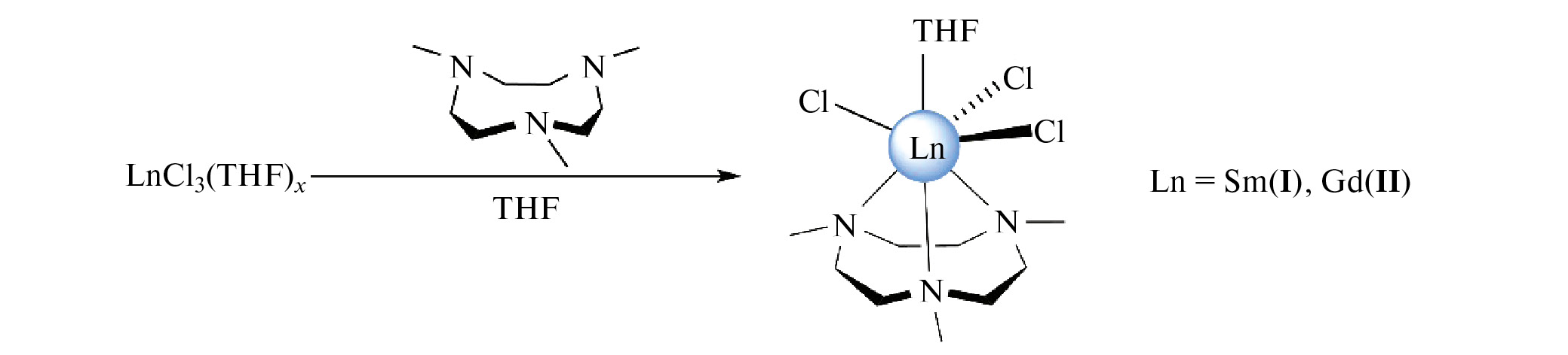 Действие раствора 1,4,7-триметил-1,4,7-триазациклононана на суспензии тетрагидрофуранатов хлоридов самария и гадолиния в ТГФ приводит к быстрому растворению осадков LnCl3(THF)x и образованию бесцветных растворов комплексов [LnCl3(Me3tacn)(THF)] (Ln = Sm (I), Gd (II); схема 1). Добавление гексана к полученным растворам приводит к образованию бесцветных кристаллов комплексов I и II. Комплексы I и II образуются даже при проведении реакции с тремя эквивалентами Me3tacn. Оба соединения умеренно растворимы в ТГФ и пиридине, но не растворимы в углеводородных растворителях, тогда как родственный комплекс [LaI3(Me3tacn)(THF)] умеренно растворим в толуоле [14]. Для самария и гадолиния комплексы такого типа ранее не были известны.