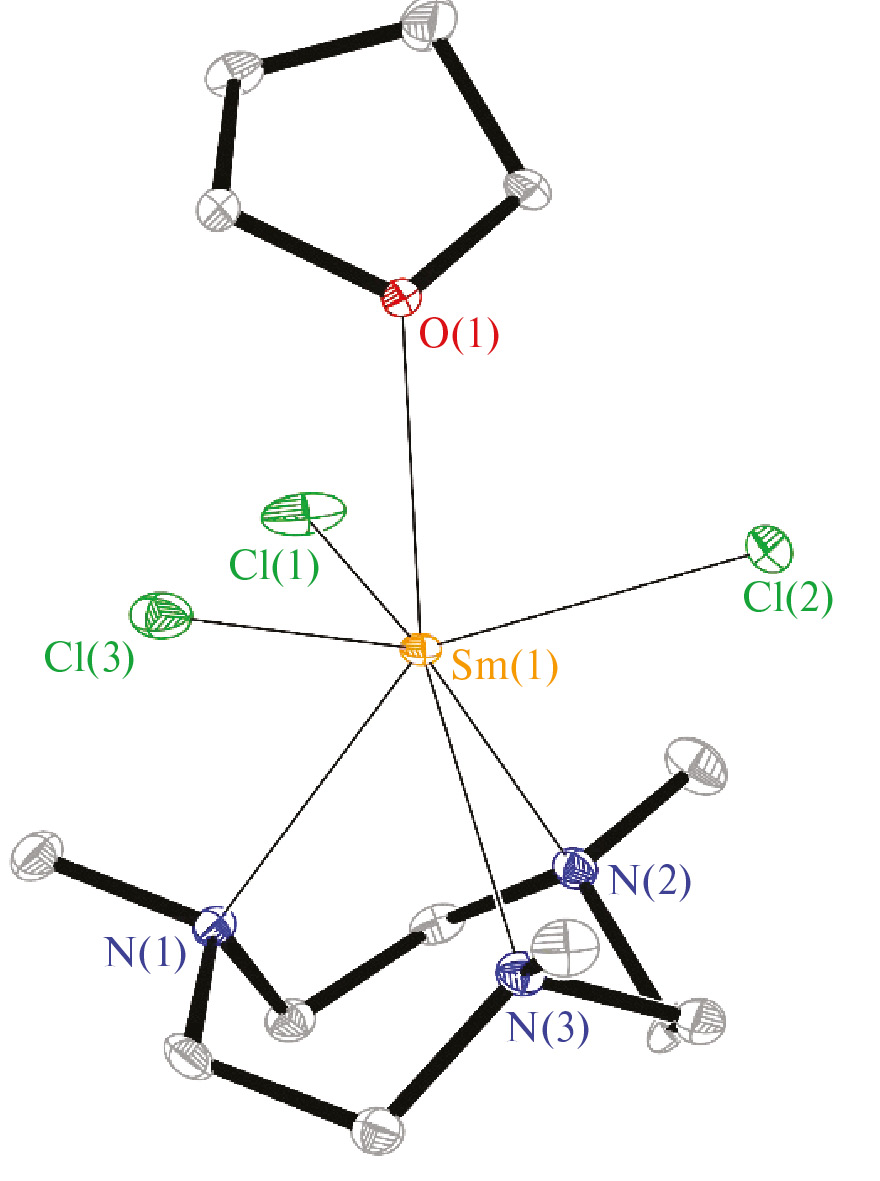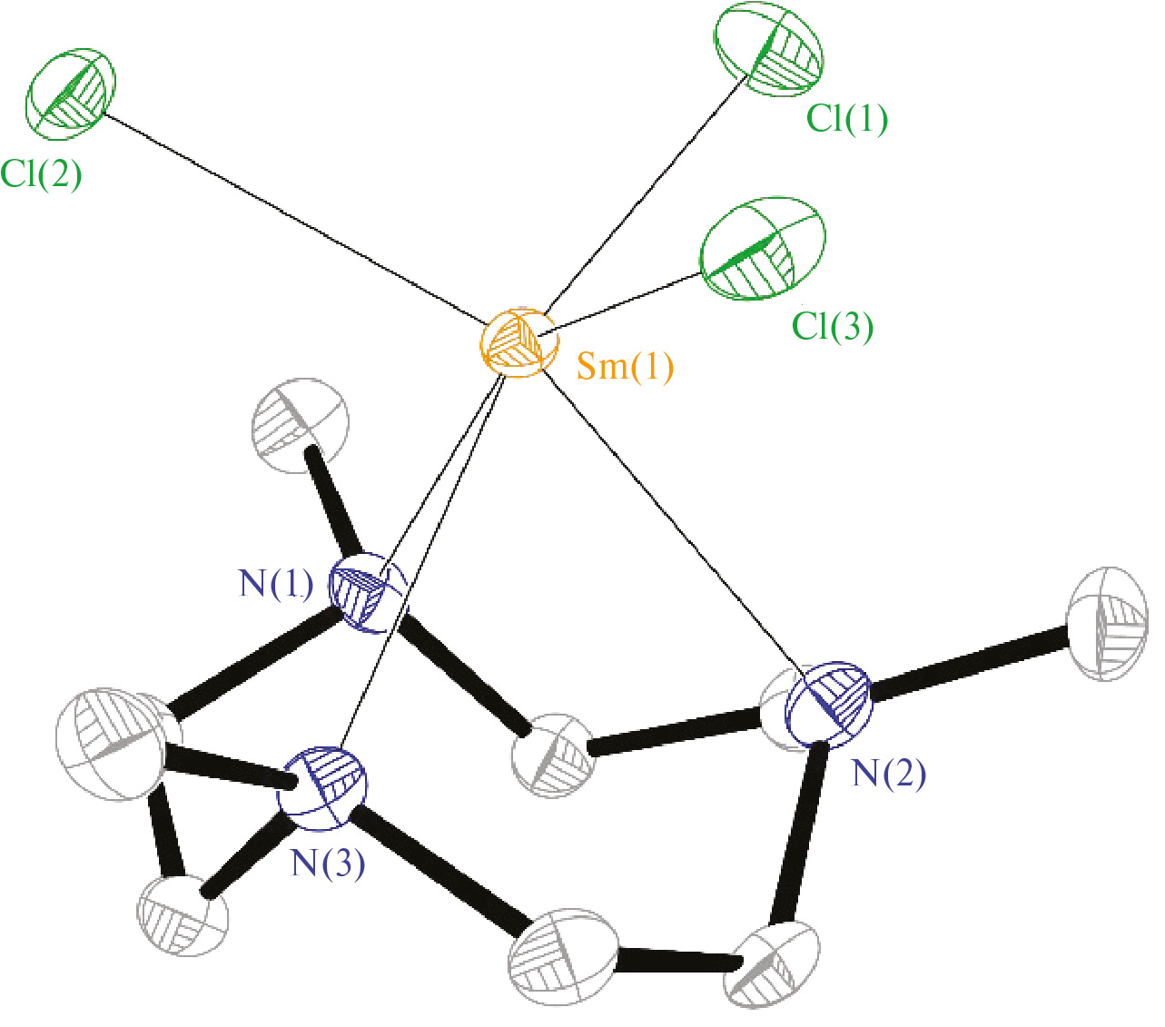 Синтез [SmCl3(Me3tacn)(THF)] (I). Раствор 0.034 г (0.2 ммоль) Me3tacn в 4 мл ТГФ при перемешивании добавляли к суспензии 0.098 г (0.18 ммоль) SmCl3(THF)4 в 10 мл ТГФ. Реакционную смесь перемешивали 12 ч. Раствор отделили от осадка центрифугированием (4000 об/мин, 7 мин), осадок промыли 5 мл ТГФ. К объединенному раствору осторожно добавляли 20 мл гексана, избегая смешения слоев. Через 3 сут получили бесцветные кристаллы. Кристаллы сушили в динамическом вакууме. Выход бесцветных кристаллов I 0.044 г (0.088 ммоль, 49%).