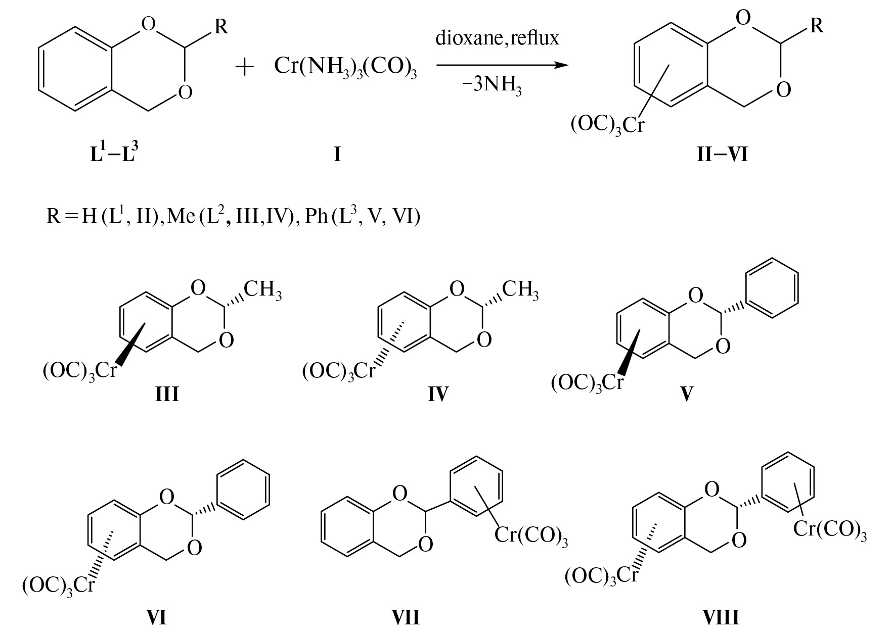 The reactions of triamminotricarbonylchromium (I) with 1,3-benzodioxane (L1), 2-methyl-1,3-benzodioxane (L2), and 2-phenyl-1,3-benzodioxane (L3) afford new complexes: (η6-C8H8O2)Cr(CO)3 (II), exo- and endo-[2-Me-(η6-C8H7O2)]Cr(CO)3 (III, IV), exo- and endo-[2-Ph-(η6-C8H7O2)]Cr(CO)3 (V, VI), [2-(η6-Ph)-C8H7O2]Cr(CO)3 (VII), and endo-[2-(η6-Ph)]Cr(CO)3-[η6-C8H7O2]Cr(CO)3 (VIII). The structures, compositions, and purity of the synthesized products are proved by UV, IR, and 1H NMR spectroscopy, HPLC, and mass spectrometry. The molecular structures of complexes IV–VI are determined by XRD (CIF files CCDC nos. 2263301 (IV), 2295552 (V), and 2237106 (VI)). A possibility of coordination of the tricarbonylchromium group at different sides of the phenylene ring of ligands L2 and L3 and on the phenyl substituent of ligand L3 is shown.
