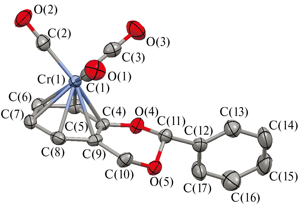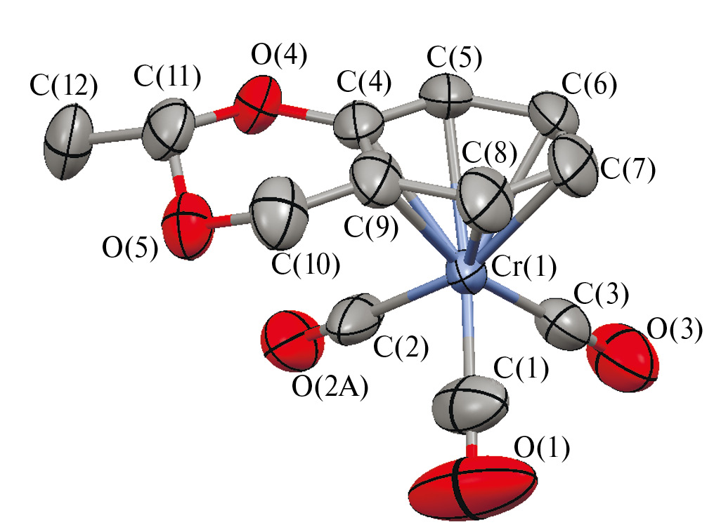Строение соединения IV подтверждалось нами также методом РСА (рис. 1, табл. 3). Показано, что данный комплекс состоит из двух связанных между собой колец: (η6-фенилен)хромтрикарбонильного фрагмента и насыщенного шестичленного гетероцикла с двумя атомами кислорода, в котором метильный заместитель занимает экваториальное положение. Гетероциклическое кольцо не является плоским, его конформация близка к «конверту». Наиболее сильное отклонение от плоскости наблюдается на участке sp3-гибридизованного атома кислорода O(5), ориентированного в сторону хромтрикарбонильной группы. Величина угла С(11)О(5)С(10) составляет 110.33°. Атом кислорода O(4) сопряжен с фениленовым кольцом, на это указывает величина валентного угла C(4)O(4)C(11), равная 115.82° и длина связи C(4)–O(4), составляющая 1.3561 Å, в то время как длины связей C(10)O(5) и C(11)–O(5), не участвующих в сопряжении, составляют 1.4351(17) и 1.4016(19) Å соответственно. Конформация ХТ-группы близка к заслоненной. Величины углов OСCrCO находятся в диапазоне 88.41°–90.07°.
