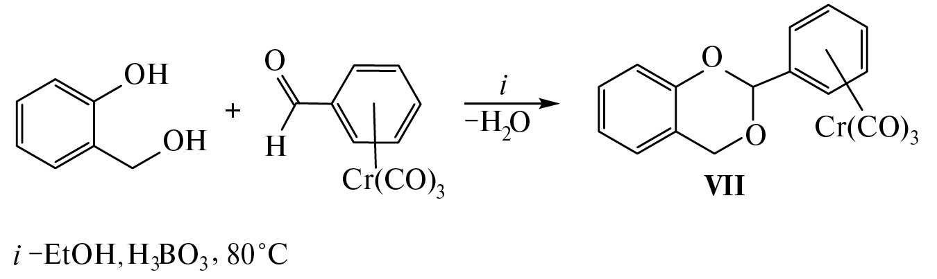 Синтез комплекса (VII) по реакции салицилового спирта с (η6-бензальдегид)хромтрикарбонилом. 0.300 г (1.24 ммоль) (η6-бензальдегид)хромтрикарбонила, 0.154 г (1.24 ммоль) салицилового спирта, 0.068 мг (1.1 ммоль) борной кислоты и 12 мл этилового спирта нагревали в запаянной дегазированной ампуле в течение 10 ч при 80°С. По окончании реакции отгоняли растворитель при пониженном давлении. Продукт реакции выделяли с помощью колоночной хроматографии. Выход 42 мг (10%), Tпл = 130–131°C. ВЭЖХ — 1 пик, τ = 7.5 мин. УФ-спектр (λmax, нм): 218, 314. Масс-спектр (ЭУ, m/z (Iотн, %)): 348 [M]+ (6), 264 [M-3CO]+ (29), 158 [M-3CO-C6H4-CH2O]+ (100). ИК-спектр (v, см–1): 3088 ν(CAr–H), 2920, 2852 ν(C–H), 1967, 1905 ν(C≡O), 1627, 1589 ν(СAr–СAr), 1246, 1036 ν(C–O), 999, 764, 625 ν(СAr–H). Спектр ПМР (δ, м.д.): 5.02 д. (1H, CH2, J = 14.48 Гц), 5.23 д. (1H, CH2, J = 14.48 Гц), 5.64–5.71 м. (3H, PhCr), 5.85 с. (1H, CH), 5.90–5.95 м. (2H, PhCr), 6.92 д. (1H, С6Н4, J = 8.22 Гц), 6.99 т. (1H, С6Н4, J = 7.43 Гц), д. 7.12 (1H, С6Н4, J = 7.43 Гц), 7.22 т. (1H, С6Н4, J = 7.43 Гц).