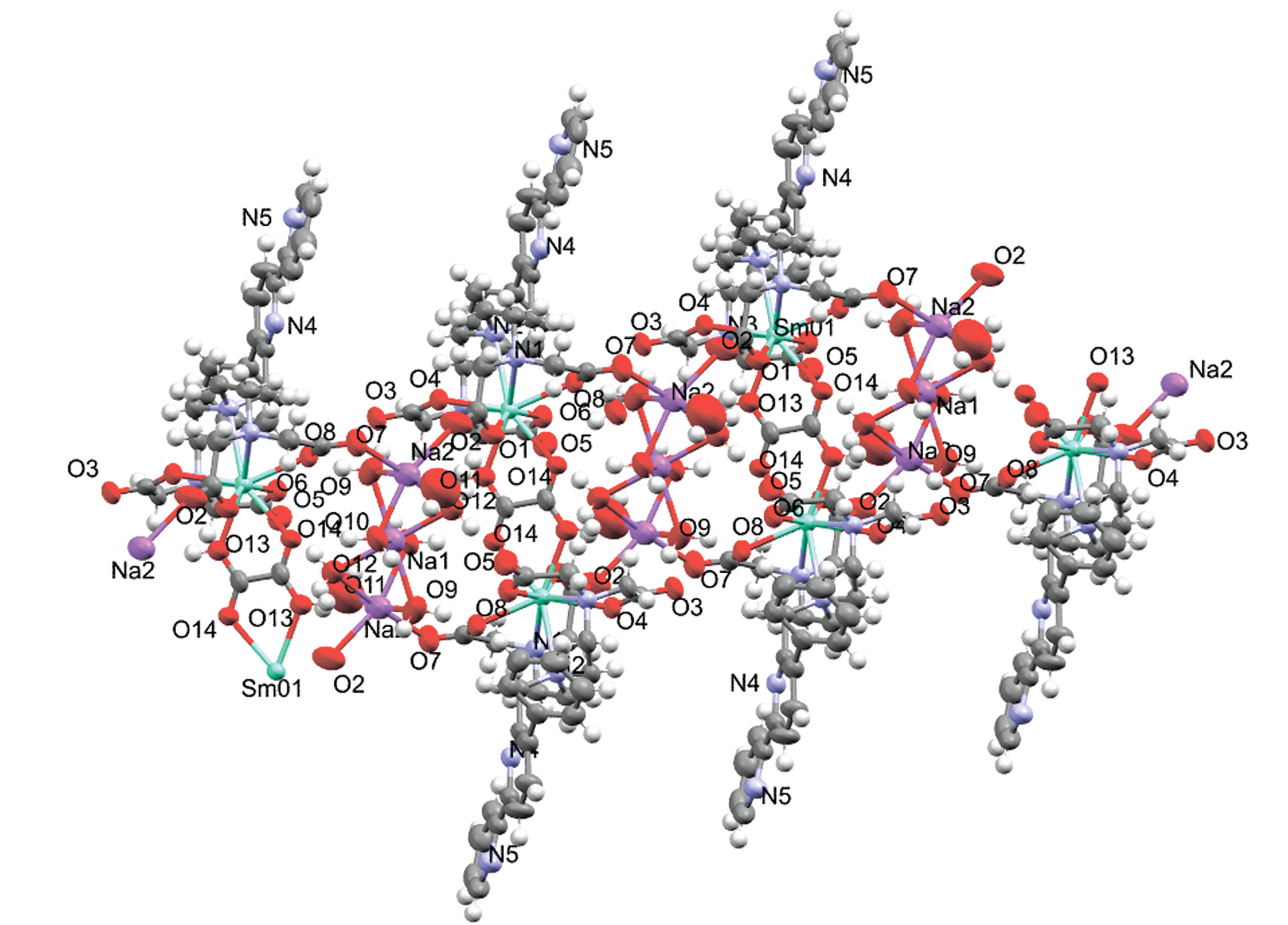 Основные кристаллографические параметры соединения I: кристалл C60H58N10Na5O20Sm2 • 9(H2O) [+ вода], моноклинный, пространственная группа P21/n, Z = 2, при 295 К; a = 18.6930(4); b = 9.9504(2); c = 24.1619(6) Å, β = 101.415(2)о, V = 4405.28(17) Å3, ρ(выч.) = 1.349 г/см3, μ = 1.410 мм–1. Диапазон съемки 2.3° < θ < 26.4°, измерено 638243 отражения, независимых 9013 (Rint = 0.283), из них наблюдаемых 7073 от ражения с I > 2σ(I). Окончательные значения факторов расходимости R1 = 0.0756, wR2 = = 0.1416 по наблюдаемым отражениям с I > 2σ(I), R1 = 0.0968, wR2 = 0.1505 по всем отражениям, фактор добротности GOOF = 1.13. Пики остаточной электронной плотности 1.87/–0.67 e Å3.
