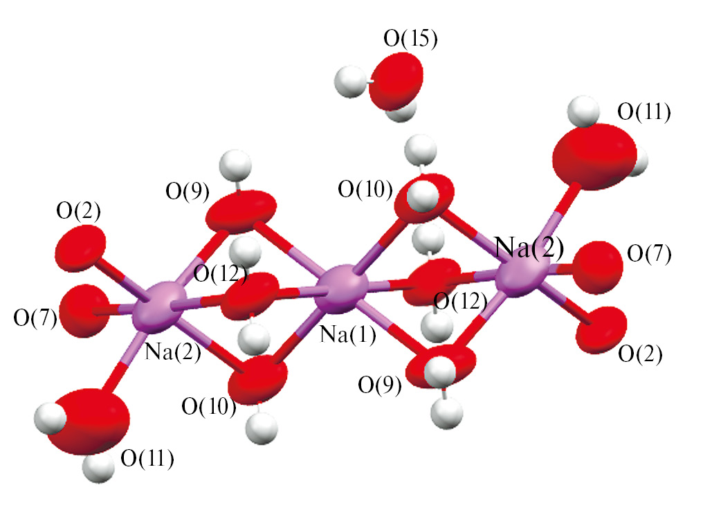Центральная часть звена образована тремя катионами натрия, один из которых находится в центре симметрии (рис. 3). Катионы натрия имеют октаэдрическую координацию и окружены молекулами воды. Центральный ион координирован молекулами воды, которые являются мостиковыми между ним и концевыми ионами натрия. Терминальные катионы натрия связаны с четырьмя молекулами воды (три из которых мостиковые) и двумя атомами кислорода аминокислотных фрагментов, принадлежащих к различным самариевым комплексам.