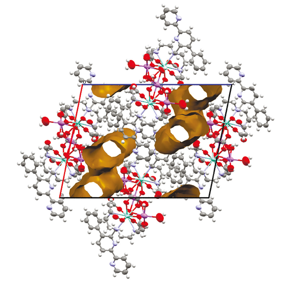 При уточнении структуры оказалось, что в кристалле имеются крупные полости, в которых не обнаружено сольватных молекул; в разностных рядах Фурье электронной плотности нет сильных пиков, которые можно было бы отнести к сольватным молекулам. Структура далее была уточнена с использованием процедуры SQUEEZE (уточнение с неопределенным растворителем). Объем полостей в ячейке кристалла составляет 1062 Å3 или 24% от объема ячейки. На ячейку приходится четыре канала примерно цилиндрической формы, диаметр канала около 6 Å. В этом свободном объеме могут находиться до 27 молекул воды (до семи молекул в асимметрической части кристалла), а рассчитанные плотность кристалла и коэффициент линейного поглощения не соответствуют реальным. Поскольку кристалл был выращен в водной среде, наиболее вероятным является вариант, когда полости содержат в основном молекулы воды, которые не имеют фиксированных положений и не вносят вклад в структурные амплитуды и интенсивности измеряемых отражений (рис. 4). Полости представляют собой бесконечные каналы вдоль кристаллографической оси b, и в этих каналах небольшие молекулы могут перемещаться относительно свободно, не образуя кристаллической упорядоченности.
