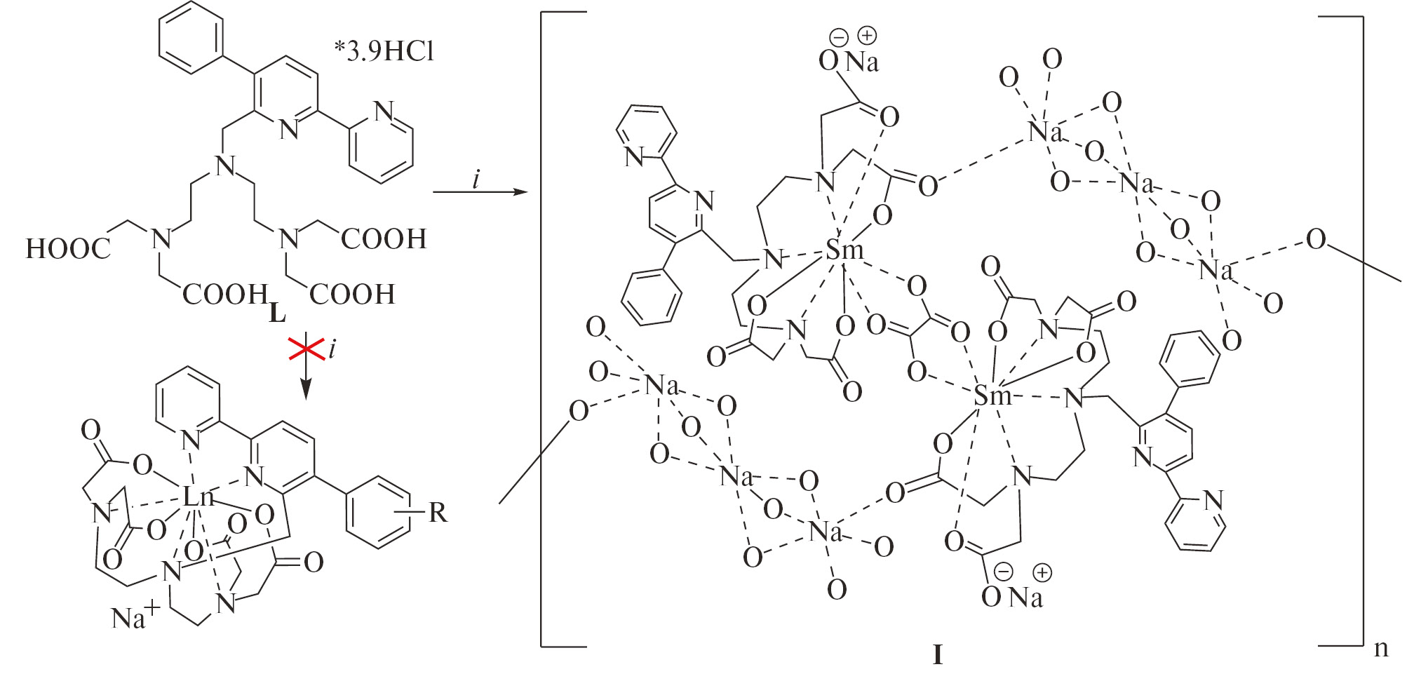 Люминесцентные водорастворимые комплексы катионов лантанидов(III) представляют интерес c точки зрения фосфоресцентного иммуноанализа [1, 2] в качестве сенсоров на катионы металлов [3], а также синглетный кислород [4]. В качестве лигандов для катионов лантанидов(III) могут быть использованы 2,2´-бипиридины, имеющие в α-положении остаток полиаминокарбоновой кислоты (DTTA или DO3A), присоединенный через метиленовый мостик [5, 6]. Такая структура лиганда обусловлена координационным числом катиона лантанида(III), равным 9, а также его жестким характером. В частности, нашей научной группой был проведен цикл работ по получению лигандов для катионов лантанидов(III) такого типа на основе (ди)арилсодержащих бипиридинов и изучению фотофизических свойств их комплексов [7–9]. Так, в качестве лигандов были использованы 5-арил-2,2´-бипиридины с остатком DTTA в положении С6; комплексы катиона европия(III) с ними показали наличие характеристичной люминесценции Eu3+ с квантовым выходом до 12.8% [10]. В настоящей работе мы представляем неожиданные результаты рентгеноструктурного анализа комплекса катиона самария(III) [(L2)Sm2Na5(H2О)9(C2O4)]n (I) на основе одного из лигандов этого ряда, а именно 5-фенил-2,2´-бипиридина с остатком DTTA в положении С6 (L).