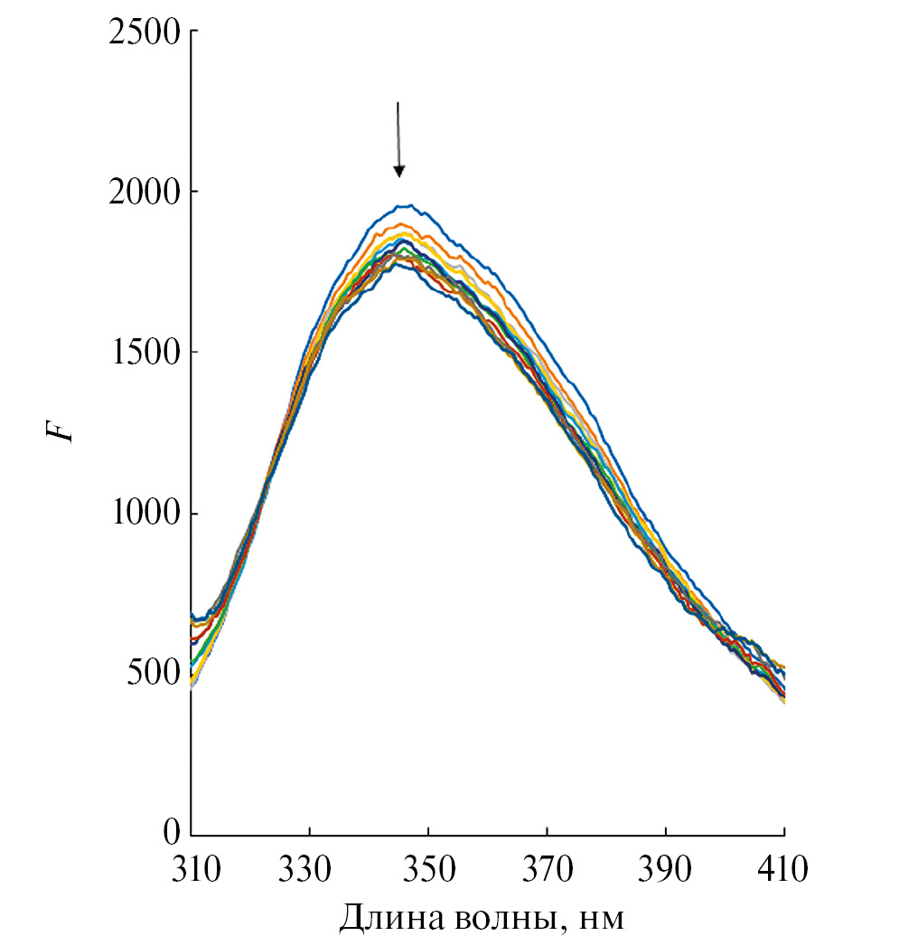 Вероятно, в случае ZnPorN и ZnPorO доминируют процессы (2), (1) и, возможно, (4) и (3) для ZnPorO. В случае ZnPorS достаточно быстро протекают процессы (2) и (3). Для уточнения характера межмолекулярного взаимодействия было выполнено обратное флуоресцентное титрование БСА-растворов растворами цинк(II)порфиринов при длине волны возбуждающего света 295 нм. В данных условиях флуоресценция альбумина обусловлена наличием в полипептидной цепи флуорофоров — триптофановых остатков. При титровании альбумином ZnPorS регистрируется тушение флуоресценции (рис. 3), что говорит о непосредственной близости тушителя ZnPorS к триптофановым остаткам в полипептидной цепи белка, т.е. протекании процесса (3). Константа аффинности БСА к ZnPorS достаточно высока 6.05 × 105, к сожалению аффинность альбумина к остальным исследуемым цинк(II)порфиринам определить не удалось по причине невозможности корректного учета эффекта внутреннего фильтра для порфиринов ZnPorО и ZnPorN.