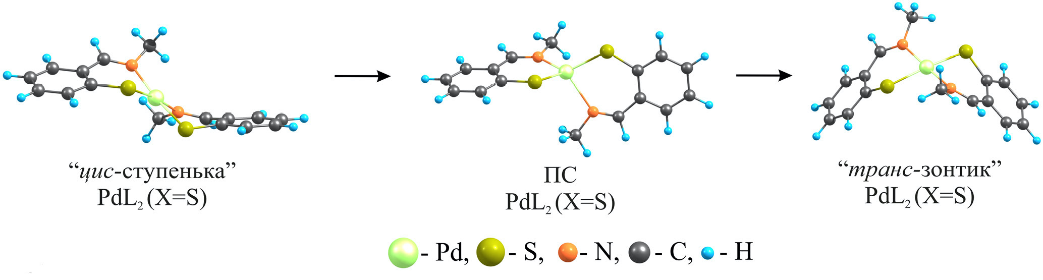 На схеме 4 представлена рассчитанная методом DFT/B3LYP/SDD структура ПС реакции изомеризации “цис-ступенька → транс-зонтик” в комплексе PdL2 (X = S).