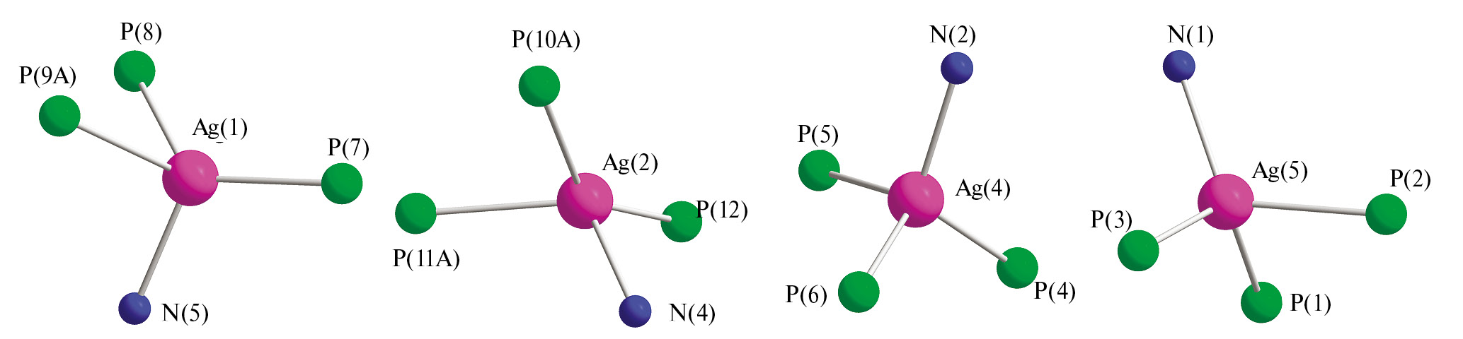 Рис. 2. Координационное окружение атомов Ag(1), Ag(2), Ag(4) и Ag(5)
