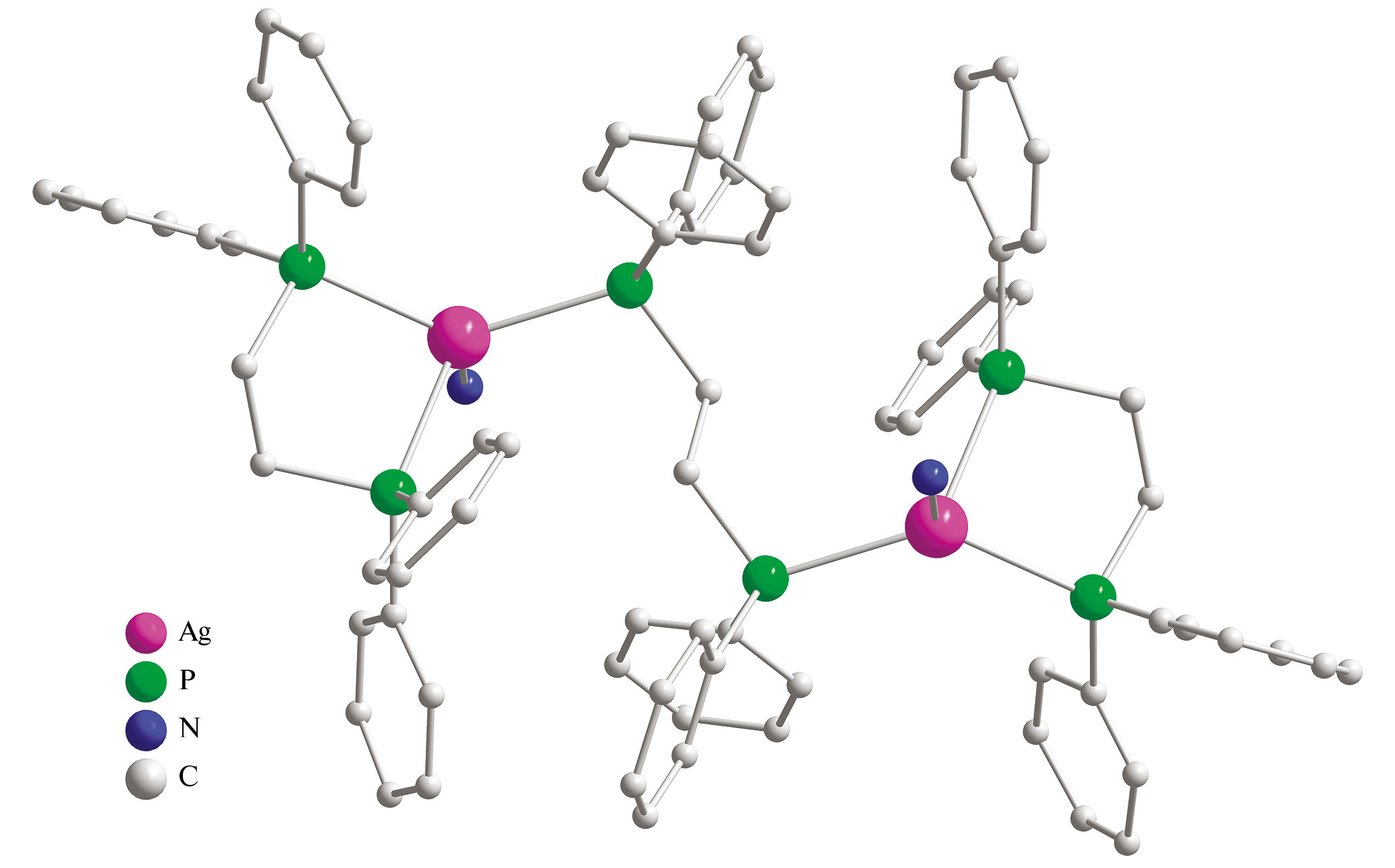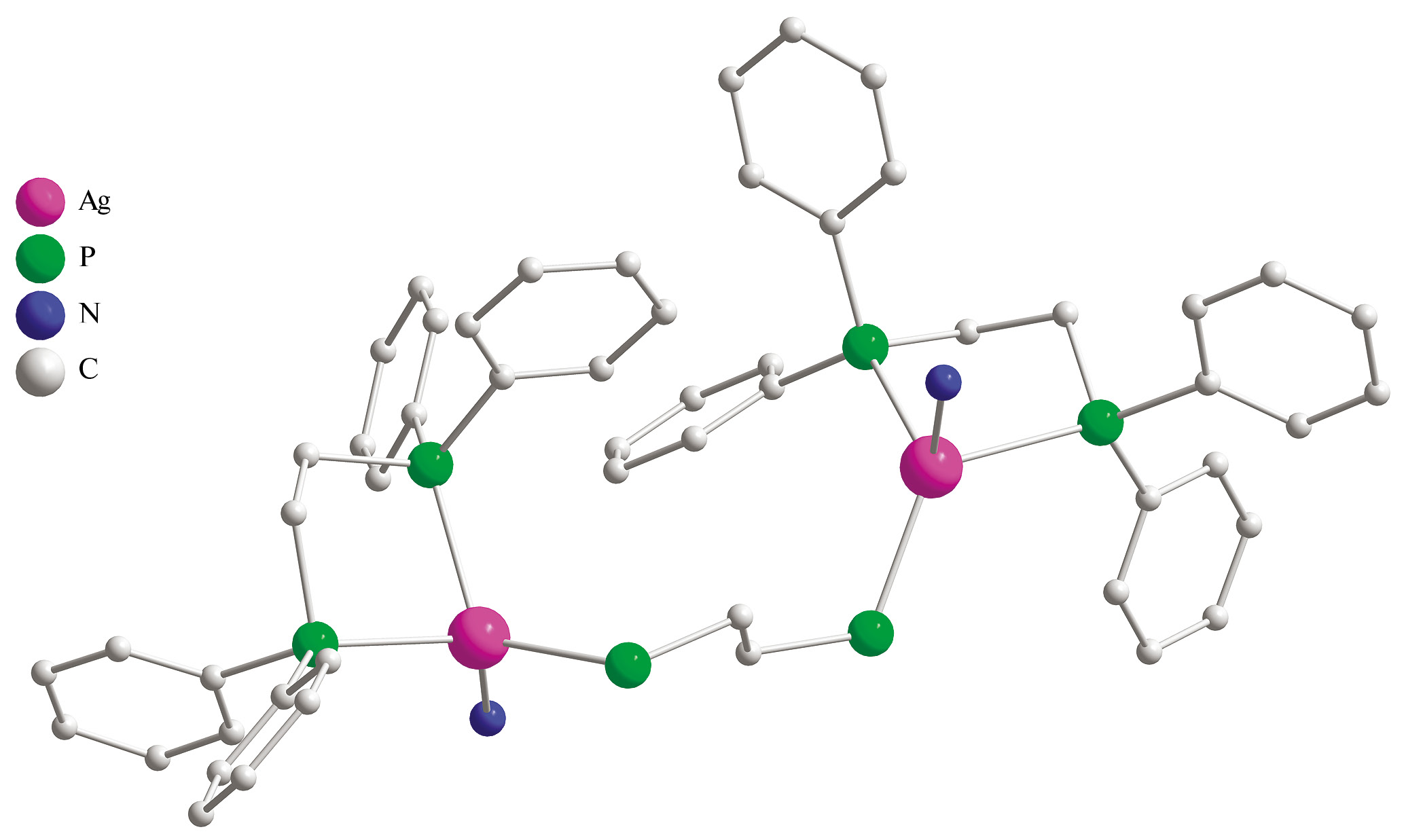 Рис. 3. Строение димерного фрагмента [{Ag(Dppe)}2µ-Dppe]2+ в соединении I. Атомы водорода, а также фенильные кольца мостиковой молекулы Dppe не показаны