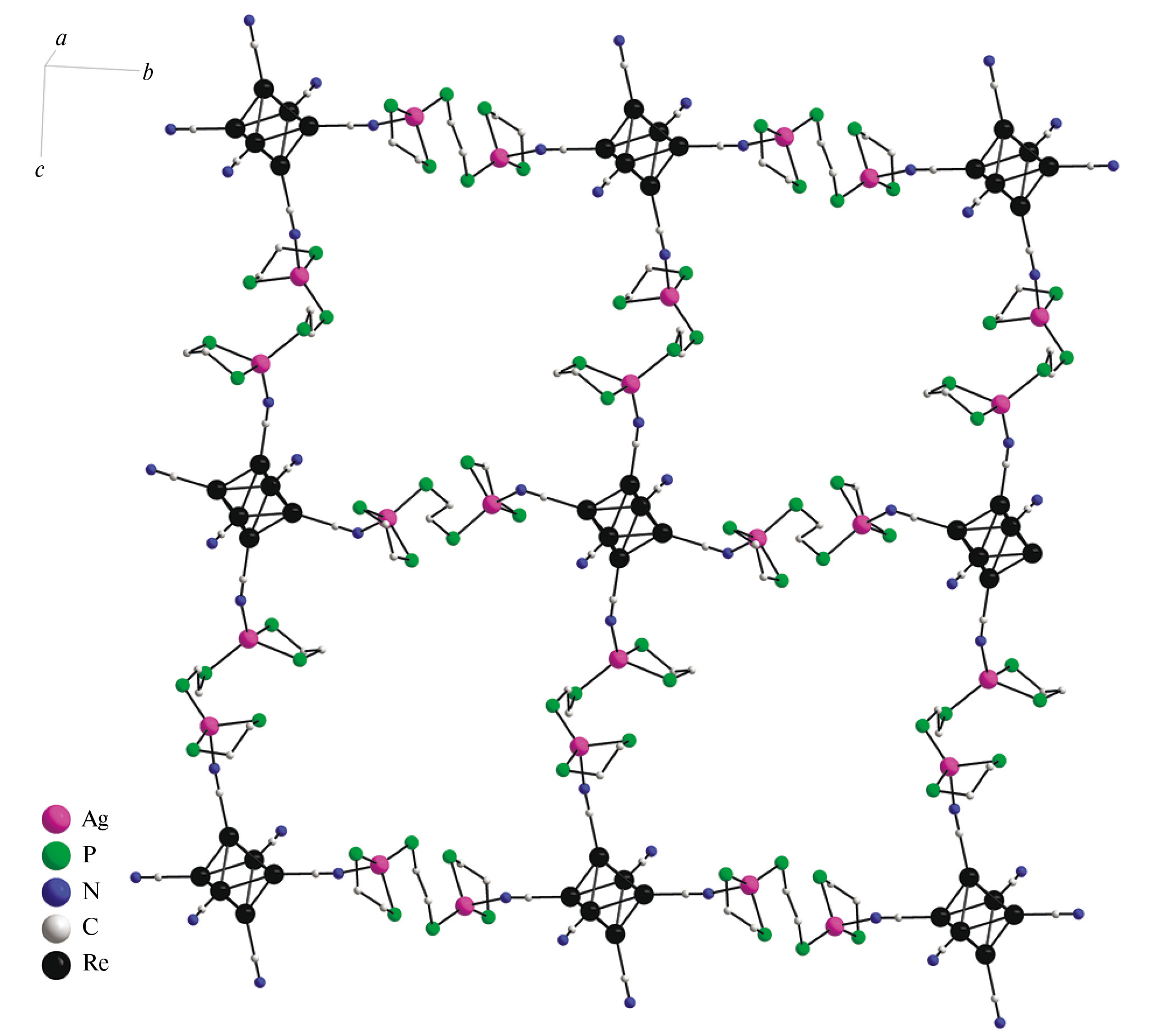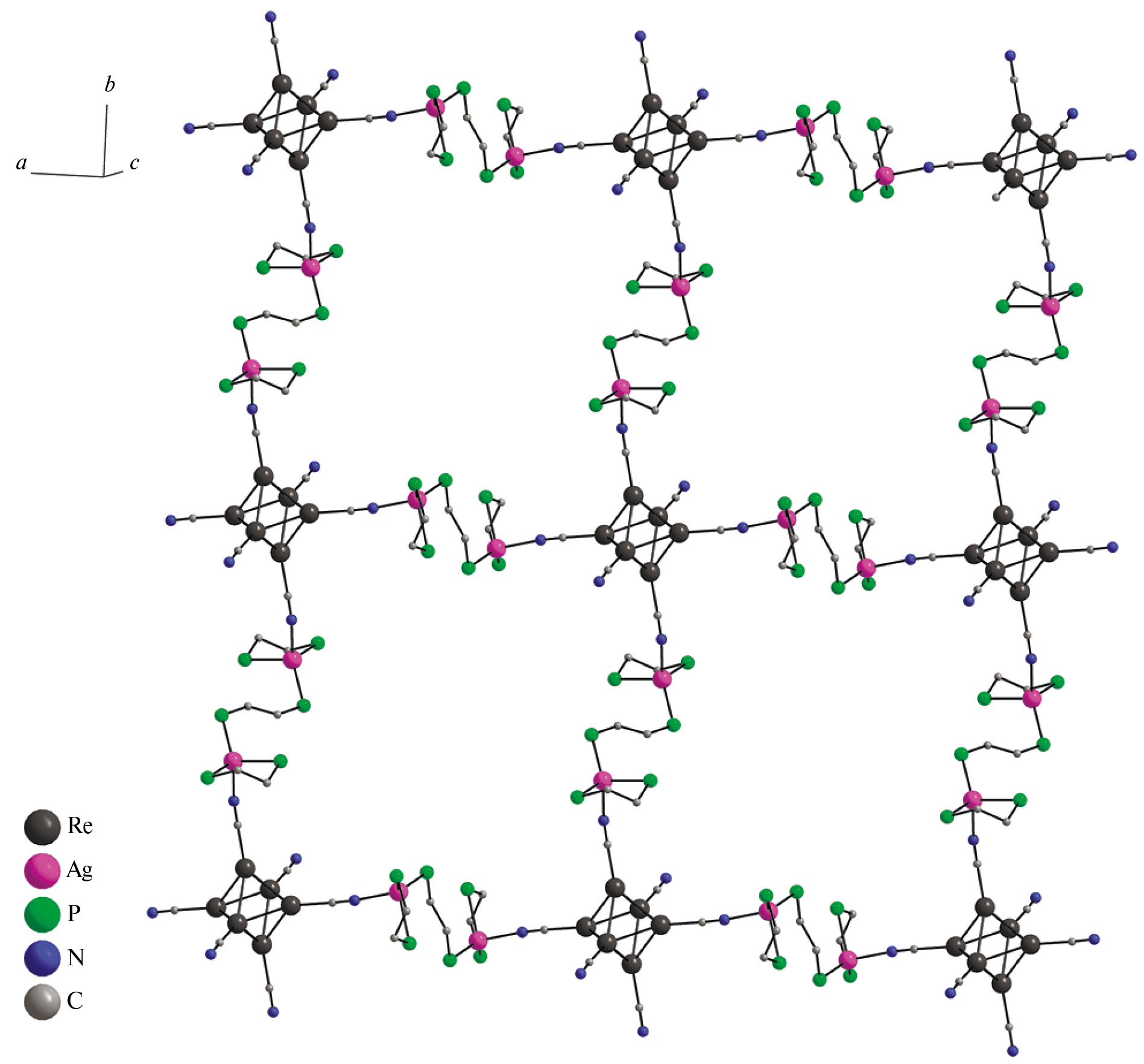 Соединение I кристаллизуется в пространственной группе P21/n. Независимый фрагмент включает шесть атомов рения, восемь атомов серы, по шесть атомов C и N шести цианолигандов, четыре атома Ag и атомы шести молекул Dppe (12 атомов P, 162 атома C, 144 атома H) (рис. 1). Также независимый фрагмент включает в себя атом кислорода сольватной молекулы H2O. Кластерный фрагмент в структуре соединения имеет геометрию, типичную для координационных полимеров на его основе [31]. Длины связей Re−Re, Re−S и Re−C приведены в табл. 2. Каждый атом серебра включает в свою координационную сферу один атом N цианогруппы кластерного комплекса и три атома P двух молекул лиганда. Таким образом, координационное число (КЧ) атома катиона Ag+ равно 4. Координационный полиэдр — искаженный тетраэдр (рис. 2). Для атомов серебра Ag(1) и Ag(2) хелатные молекулы Dppe разупорядочены по двум позициям с заселенностью 0,56 и 0,44, 0,64 и 0,36 соответственно. Два атома серебра образуют димерный катионный фрагмент {(Ag(Dppe))2(µ-Dppe)}2+ (рис. 3). Каждый атом серебра димерного катионного комплекса связан с одним атомом азота цианогруппы кластера. Каждый кластер, в свою очередь, предоставляет четыре цианолиганда в экваториальном положении для связи с атомами серебра. Таким образом образуется слой (рис. 4). В упаковке слои располагаются параллельно друг другу, образуя многочисленные π−π- взаимодействия между фенильными кольцами соседних слоев.