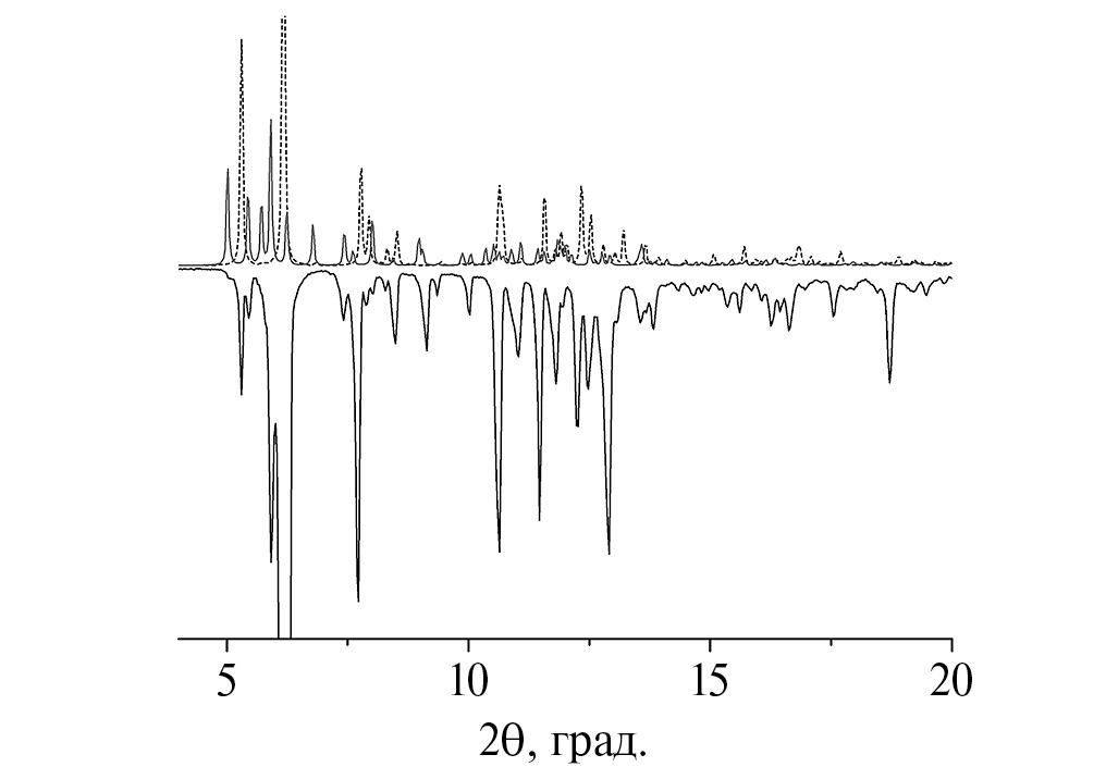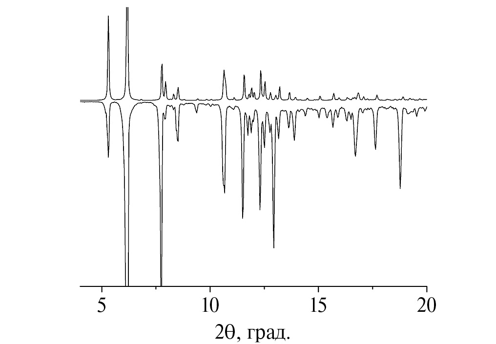 Рис. 9. Экспериментальная порошковая дифрактограмма соединения I в поликристаллическом образце (снизу) в сравнении с расчетной по структуре монокристалла (сверху)