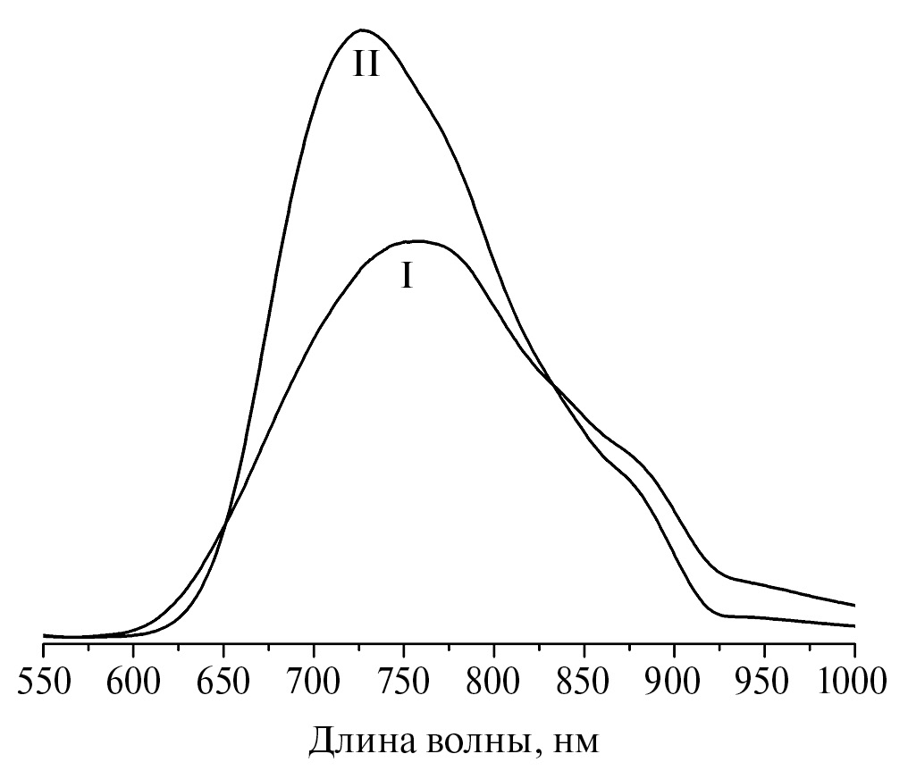 Рис. 11. Спектры фотолюминесценции соединений I и II