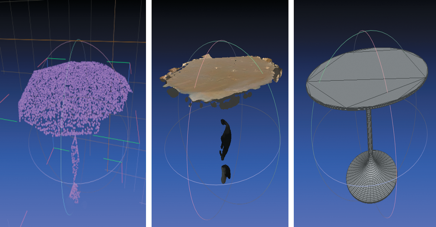 interaction with virtual objects in the real world. Like any promising direction, mixed reality has a number of unresolved problems. One of these problems is the synthesis of natural lighting conditions for virtual objects, including the correct light interaction of virtual objects with the real world. Since virtual and real objects are located in different spaces, it is difficult to ensure their correct interaction. To create digital copies of realworld objects, machine learning tools and neural network technologies are employed. These methods are successfully used in computer vision for space orientation and environment reconstruction. As a solution, it is proposed to transfer all objects into the same information space: virtual space. This makes it possible to solve most of the problems associated with visual discomfort caused by the unnatural light interaction of real and virtual objects. Thus, the basic idea of the method is to recognize physical objects from point clouds and replace these objects with virtual CAD models. In other words, it implies semantic analysis of a scene and classification of objects with their subsequent transformation into polygonal models. In this study, we use competitive neural network architectures, which can provide state-of-the-art results. The test experiments are carried out on Semantic3D, ScanNet, and S3DIS, which are currently the largest datasets with point clouds that represent indoor scenes. For semantic segmentation and classification of 3D point clouds, we use the PointNeXt architecture based on PointNet, as well as modern methods of data augmentation in the process of learning. For geometry reconstruction, the Soft Rasterizer differentiable rendering method and the Total3Understanding neural network are considered.