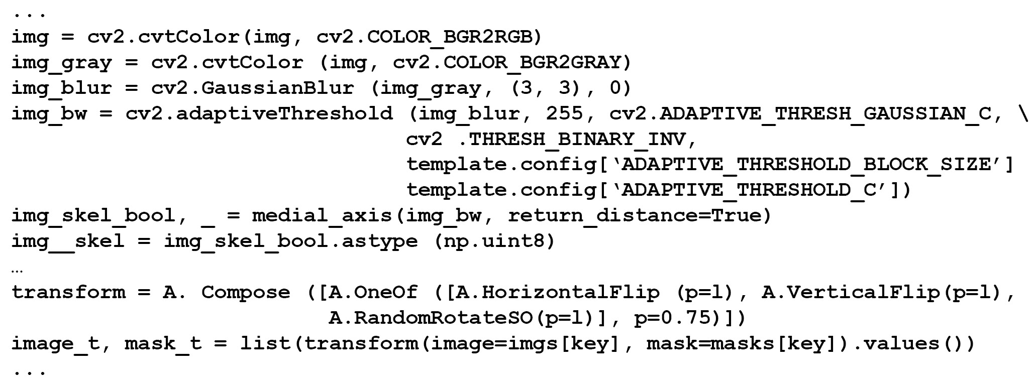 Бинаризация выполняется на основе адаптивного выделения контуров с дилатацией (adaptiveThreshold) из библиотеки OpenCV и выделением медианных пикселов (medial_axis) для линеаризации трещин из библиотеки scikit-image (рис. 3)