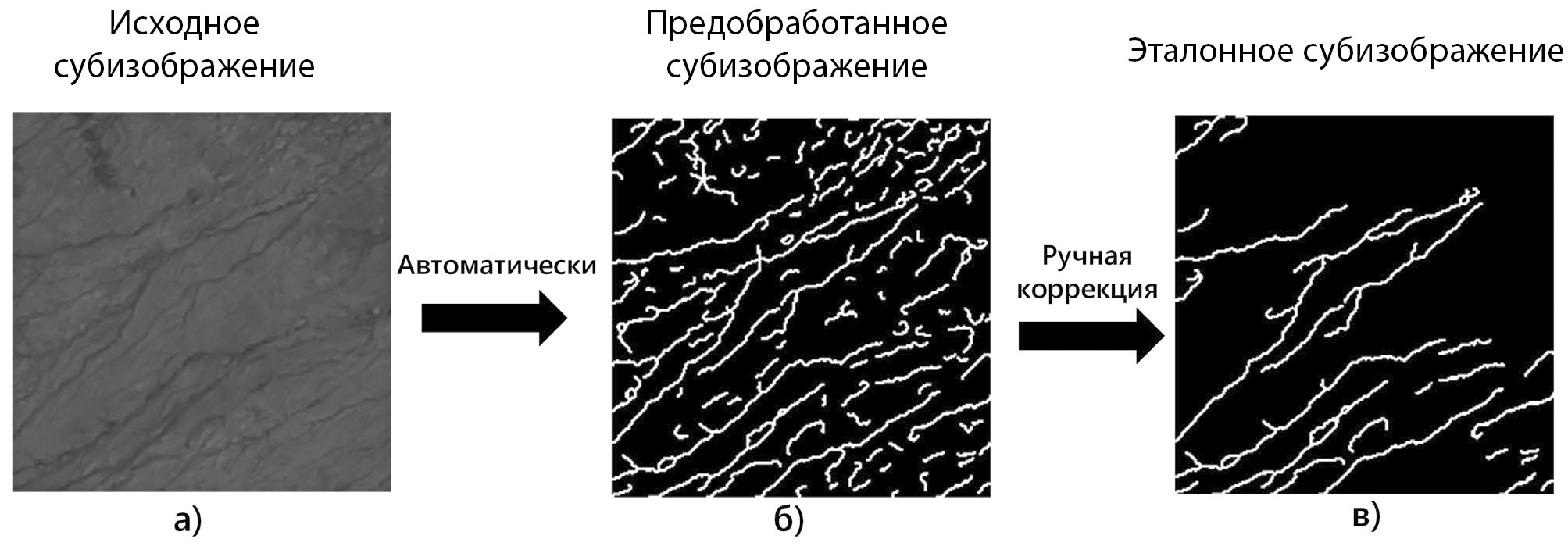 Входное изображение разбивалось на базисные субизображения (в текущей версии 256 × 256 пикселов), которые брались за основу для предварительной обработки и процесса ручной разметки данных. Предобработка строилась на базе схемы последовательных преобразований RGB-изображения в бинарное (рис. 1).