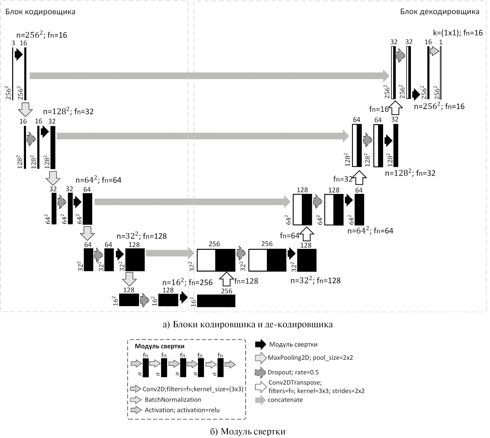 Процесс обнаружения трещин на изображениях строился на базе сверточной нейронной сети типа U-Net. Архитектура сети представляет собой полносвязную сверточную сеть [20], работающую на меньшем количестве примеров (обучающих образов) с более точной сегментацией. Сеть содержит блок кодировщика (Encoder) и блок де-кодировщика (Decoder) (рис. 4а, б). Программная имплементация сети реализована на основе пакета TensorFlow v2.11 c модулем Keras (https://www.tensorflow.org/api_docs/python/tf/keras).