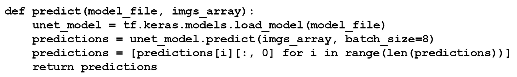 На вход метода подаются исходные субизображения (параметр imgs_array) тестовой выборки (рис. 2а). На выходе получается массив значений, каждый элемент которого соответствует положению пиксела на исходном субизображении, а значение – вероятности того, что соответствующий пиксел принадлежит классу “трещина”.