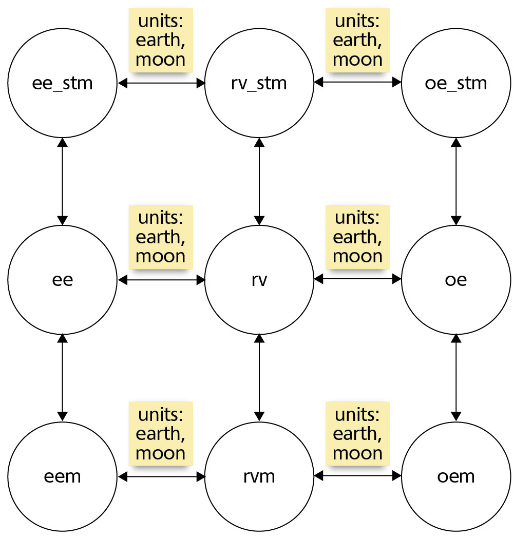 Класс Trajectory содержит графы преобразований между переменными, между системами координат и между системами единиц. Граф преобразований переменных показан на рис. 1. Здесь rv, oe, ee обозначают соответственно переменные положение–скорость, классические орбитальные элементы и равноденственные орбитальные элементы. Суффикс _stm означает те же векторы переменных, расширенные переходной матрицей (state transition matrix, STM). Суффикс m означает те же векторы переменных, расширенные добавлением массы аппарата. Стрелка означает преобразование, которое реализовано явно в классе Trajectory. Надпись над стрелкой указывает на ограничения, при которых это преобразование может быть выполнено. В данном случае некоторые преобразования ограничены используемыми системами единиц: либо ’earth’, либо ’moon’.