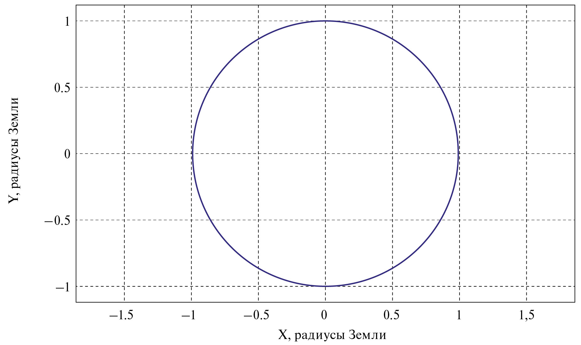 Рассмотрим несколько конкретных примеров использования модуля Trajectory. Начнем с простейшего примера. В модели задачи двух тел круговую орбиту можно получить следующим образом (с точностью до настроек осей графика и шрифтов):
