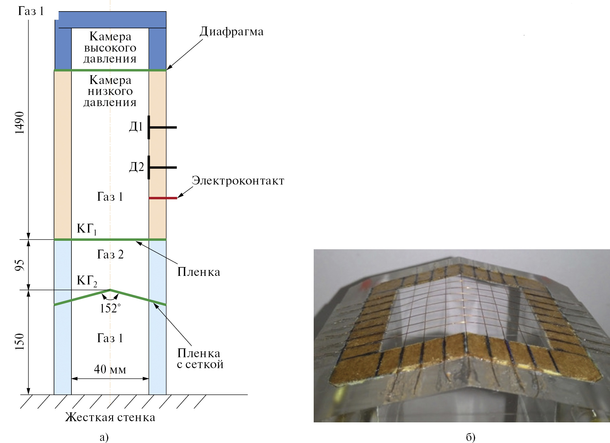 а) схема ударной трубы; б) фотография измерительной секции с 3D-сеткой 5×5 мм; Д1, Д2 – отметчики времени; КГ1, КГ2 – контактные границы