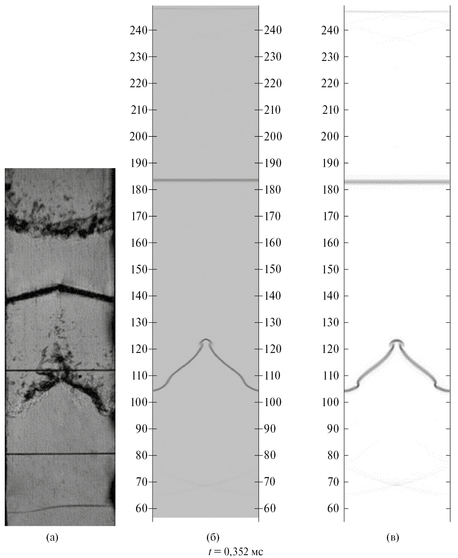 Однако имеются и более существенные отличия расчетов от экспериментов. Во всех расчетах есть небольшое отставание ударной волны, приходящей на место расположения проволочной сетки (рис. 7), по сравнению с экспериментальными данными, на рис. 9 видно, что расчетная ударная волна опережает экспериментальную. Наиболее согласующиеся с экспериментом данные получены в расчете 2 с учетом фрагментов пленки. В частности, на рис. 9 в расчете 2 отраженная от пленки волна (которая распространяется вверх по трубе) заметно ближе к экспериментальному положению. Еще более заметно, что в расчете 2 ЗТП на границе воздух–SF6 согласуется с экспериментальными данными, в то время как в расчете 1 она практически отсутствует, а имеются лишь завитушки вследствие проявления сдвиговой неустойчивости, а в расчете 3 ЗТП имеется, однако она значительно тоньше. Таким образом, пленка играет важную роль в данном течении и для корректного численного моделирования необходимо ее учитывать.