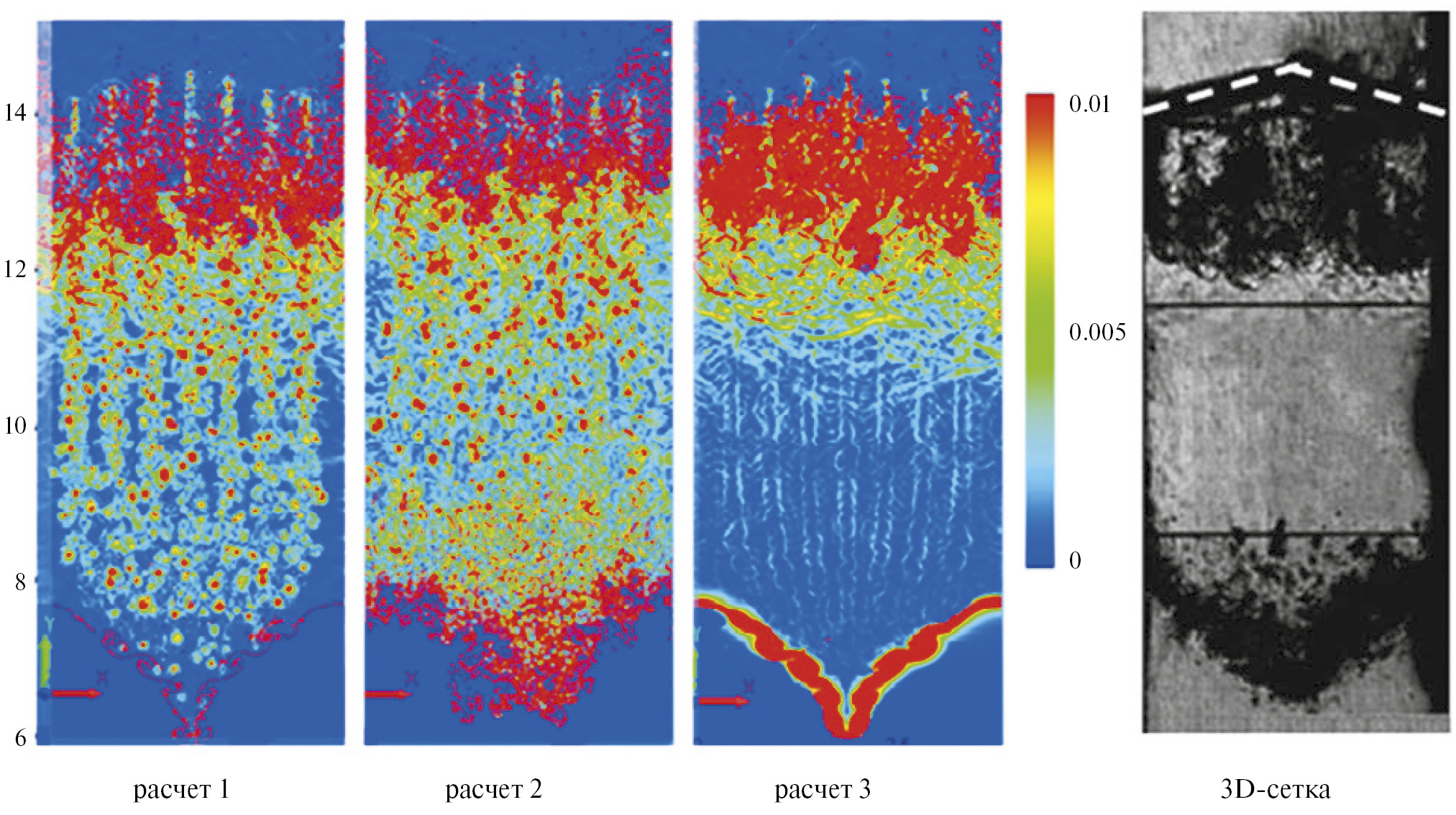 Рис. 8. Картины течения: расчеты t = 571, эксперимент с 3D-сеткой t = 571,6, эксперимент с 2D-сеткой t = 565,1.