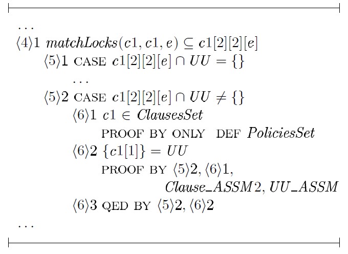 Доказательство шага ⟨1⟩ 4 строится на том факте, что любое предложение политики l является результатом применения некоторой подстановки к блокировкам предложения c1 или c2 с последующим объединением блокировок этих предложений — unionCl (c1,c2), где c1 ∈ p1 и c2 ∈ p2. Для доказательства шага ⟨1⟩ 5 в общем виде необходимо выбрать произвольную политику y ∈ PoliciesSet, произвольное предложение y1 ∈ y и доказать: ∃c1, c2, l1 : c1 ∈ p1 ∧ c2 ∈ p2 ∧ l1 ∈ l (c1 ⊆ y1 ∧ c2 ⊆ y1 => l1 ⊆ y1):