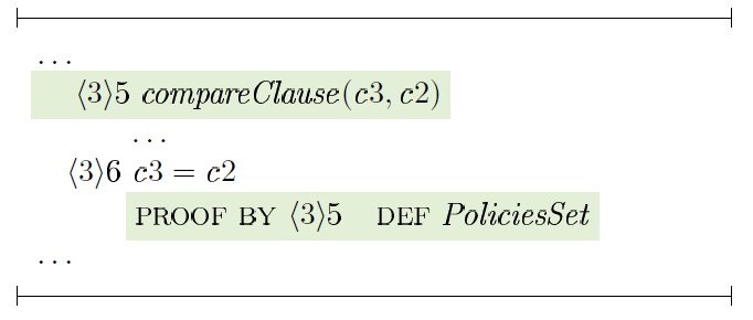 Поскольку выражение политики безопасности не может содержать двух различных предложений c1 и c2, таких, что c1 ⊆ c2 или c2 ⊆ c1, для доказательства шага ⟨3⟩ 6 достаточно доказать, что c3 ⊆ c2: