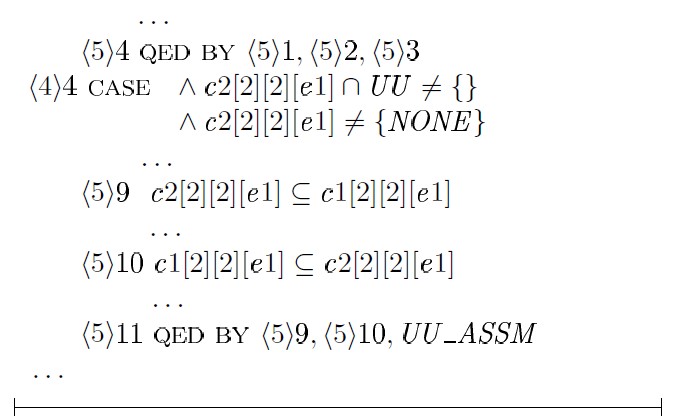 Доказательство шага ⟨5⟩ 2 тривиально. Доказательства шагов: ⟨5⟩ 3 и ⟨5⟩ 4 в полном объеме для краткости не приводятся. Отметим лишь, они основаны на том факте, что c1 ⊆ c2 ∧ c3 ⊆ c1, а также на предположениях: U_ASSM и UU_ASSM.