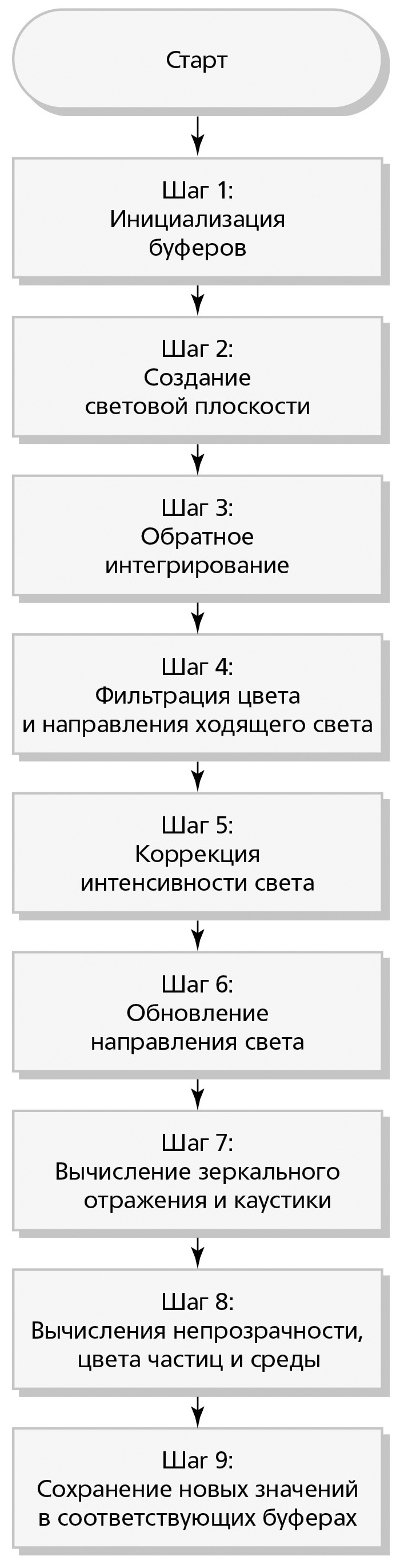Шаг 7. Вычисление зеркального отражения и каустики. В отличие от распространения света, просмотр лучей от наблюдателя происходит с использованием прямого интегрирования. Сохраняется их положение, направление и накопленный цвет в наборе 2D-буферов. Для положения и направления лучей от наблюдателя предыдущие значения, а также накопленный цвет, непрозрачность и цвет окружающей среды извлекаются из соответствующих буферов. Входящее освещение извлекается из светового буфера и вычисляется зеркальное затенение с использованием градиента объема.